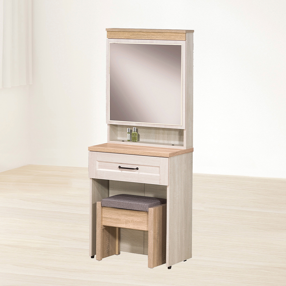 收納功能:左右滑動鏡面,推開後即是隱藏式置物架,能將瓶瓶罐罐完美收納;桌面下方配有抽屜與開門式隱藏櫃,日常化妝工具或是體積較大的囤貨用品都能妥善放置。收納式化妝椅具備儲物空間,有效利用零碎空間。
