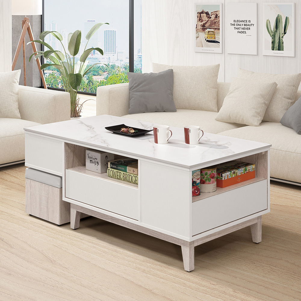 收納功能:四個大容量的隱藏式抽屜,能迅速收納物品,桌面保持整潔清爽;側邊開放式置物格,提供便利的取物空間。茶几一側完美整合收納式椅凳,既是舒適的額外坐位,也是一個不佔空間的秘密收納箱,提升了客廳的收納彈性與多功能性。