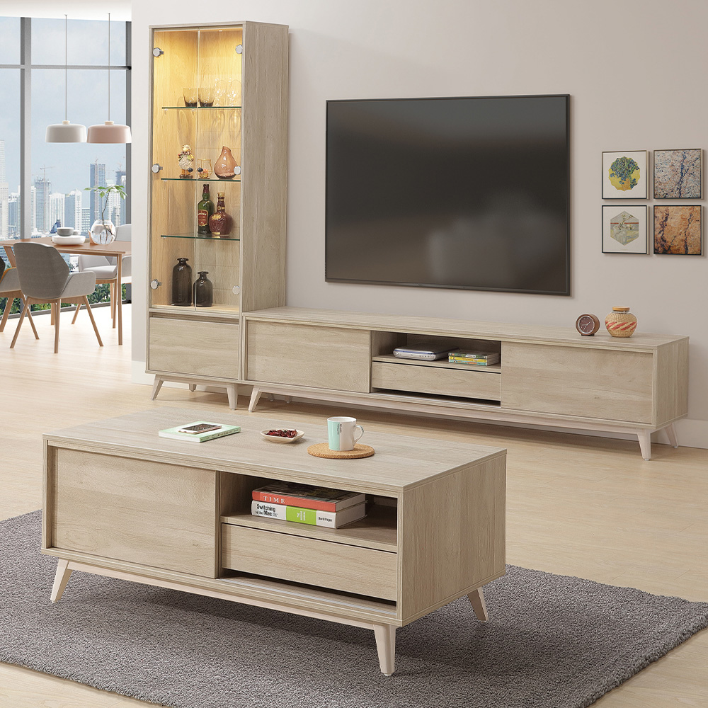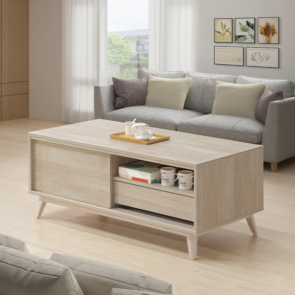 收納功能:茶几擁有雙面收納空間,正面設計了流暢的滑門與抽屜,能將零散的小物與生活雜貨完美隱藏;背面則是全開放式的通透層架,適合擺放常用的書籍、耳機或裝飾物件。靈活分配日常需求,隨手拿取與收納都變得優雅從容。