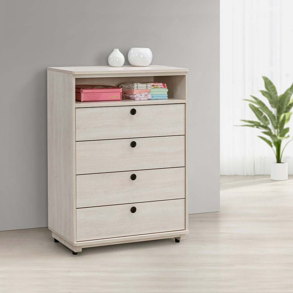 抽屜櫃設計:使用淺色木紋,營造北歐風的自然清新感。五層高身設計,極大化利用垂直空間,線條簡潔,搭配黑色圓形把手,為淺色櫃體增添現代對比,穩固的底座設計,讓櫃體輕巧卻不失穩重。