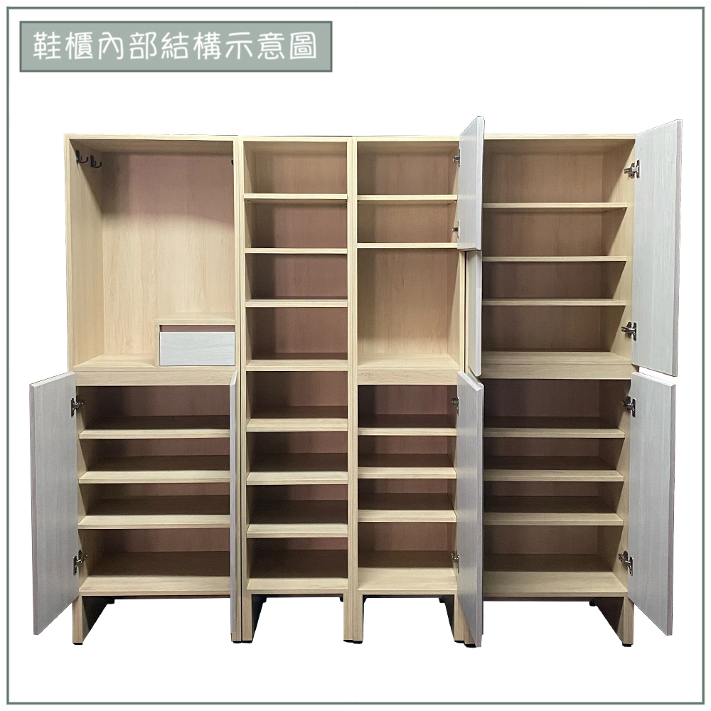收納空間:分區設計,隱藏式櫃門、開放式格層、衣帽區及小抽屜,完美整合鞋子、衣物及隨身物品的收納,滿足一家人的收納需求,讓出門和回家的流程更順暢。