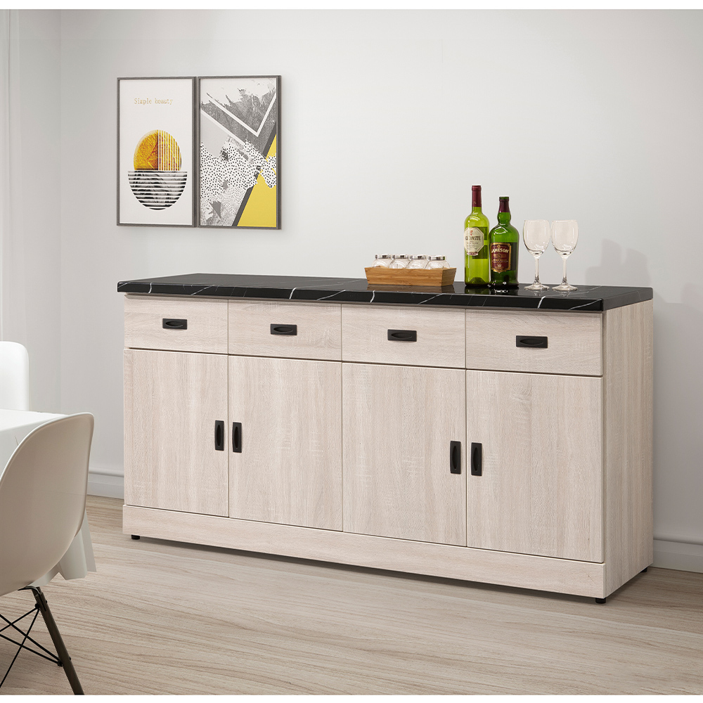 收納空間:人造石紋檯面,不僅可用於美觀展示,也是備餐、放置飲品或電器的理想工作區。抽屜適合分類收納餐具、餐墊或各種小物,確保快速取用並且保持檯面整潔。櫃門提供充足的隱藏空間,能夠放置大型餐具、鍋具、雜物或酒品收藏,滿足居家物品的分類儲存需求。