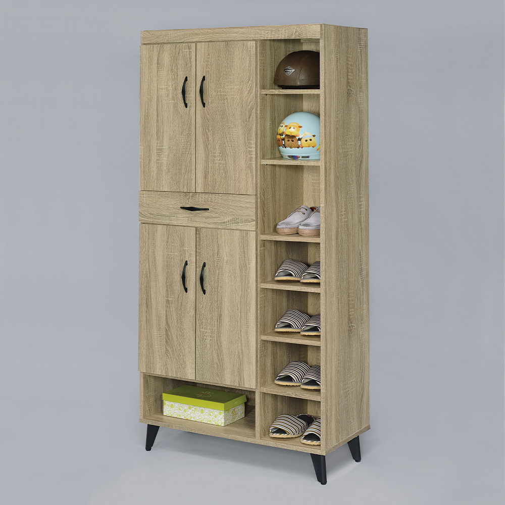 收納功能:結合上下兩組雙門櫃,可有效防塵並隱藏物品;中央抽屜層,方便快速拿取鑰匙、信件等零散小物;右側多層開放式空間,鞋款一目瞭然,換穿便利;底部開放層,能容納大型鞋盒或收納籃,實現高效且美觀的收納。