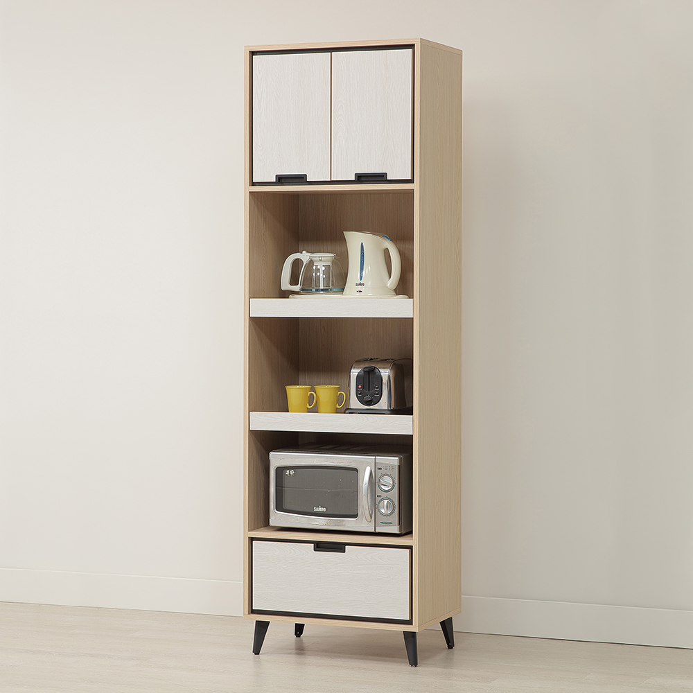 收納空間:頂部設有雙開門櫃,可防塵及存放不常用物品;中間兩層是開放式托盤抽屜,專為微波爐、烤箱、熱水壺等各式廚房小家電設計,取用便利;底部的隱藏式抽屜能妥善收納零散餐具或雜物,讓空間整潔又充滿效率。