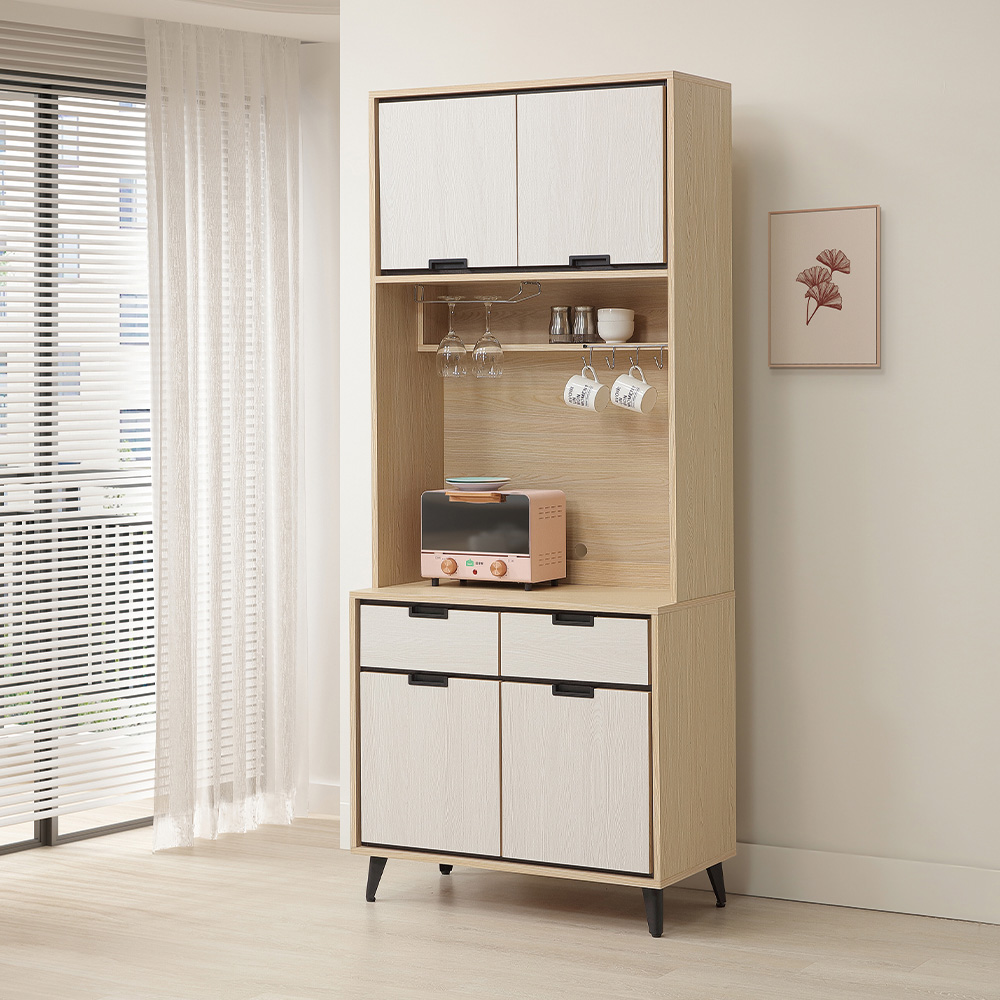 收納空間:上層櫃門內適合存放不常使用的備品或電器;中間開放式層架可以展示常用的咖啡杯或調味料,另有貼心配備紅酒杯架及掛勾;檯面可作為備餐或電器工作區;下層提供兩個抽屜,方便分類收納零散餐具,櫃門則能穩妥收納鍋具與碗盤,完美滿足餐廚空間的多功能儲物需求。