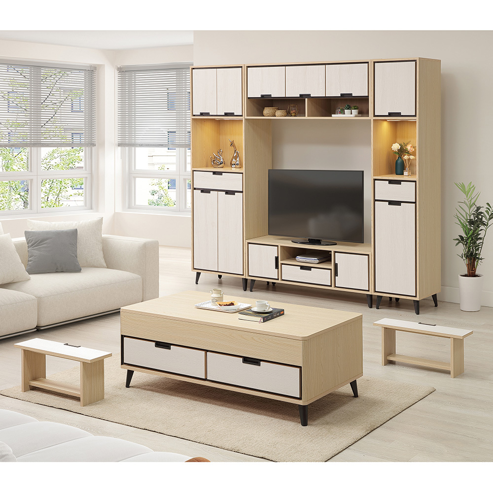 收納空間:結合「隱藏、展示、實用」三大機能,利用頂部與兩側的收納櫃將雜物化整為零,搭配中段內嵌暖光的開放層板營造溫馨展示角落,底部更規劃了專屬視聽電器區,從日常雜物到展示收藏,全都能被妥妥安放。