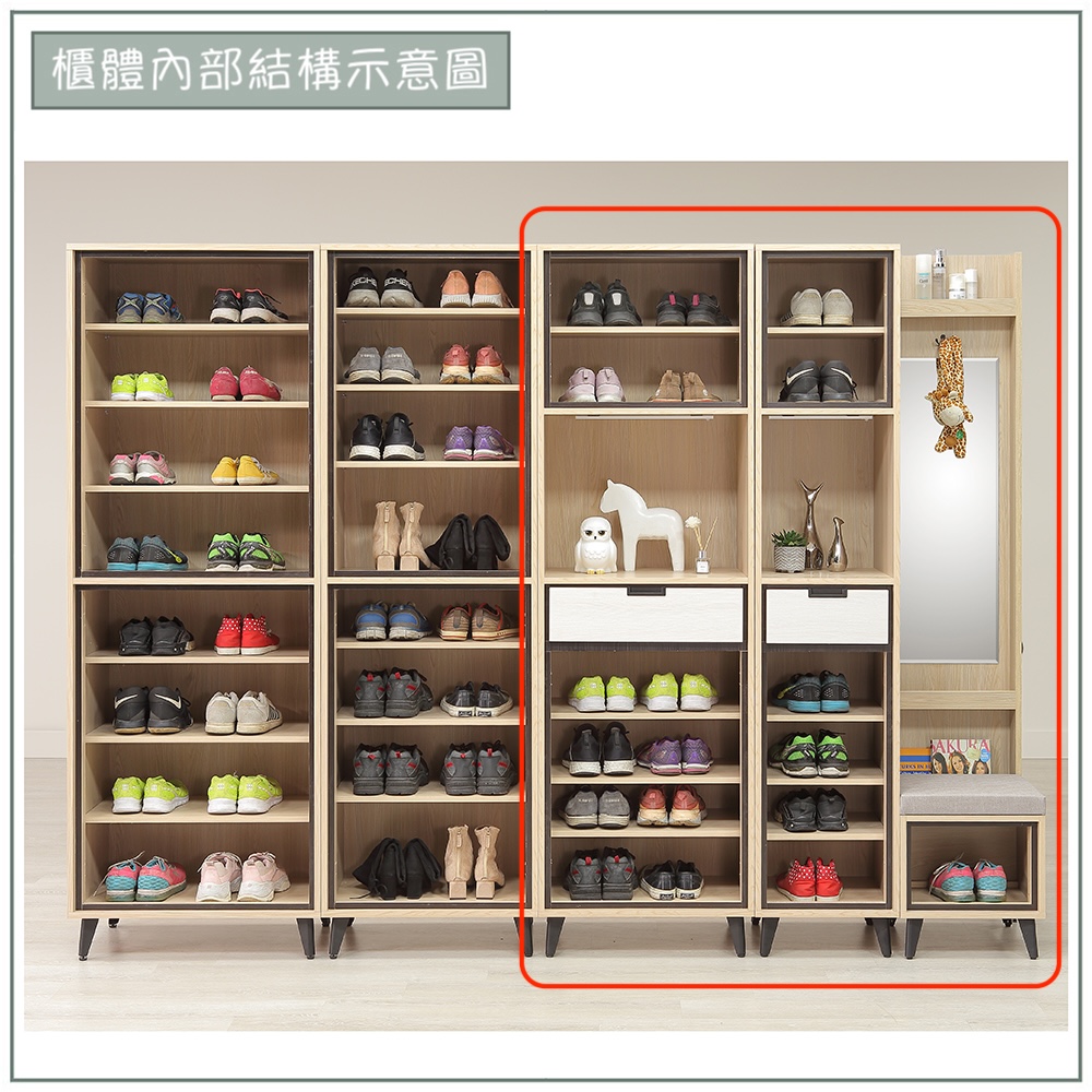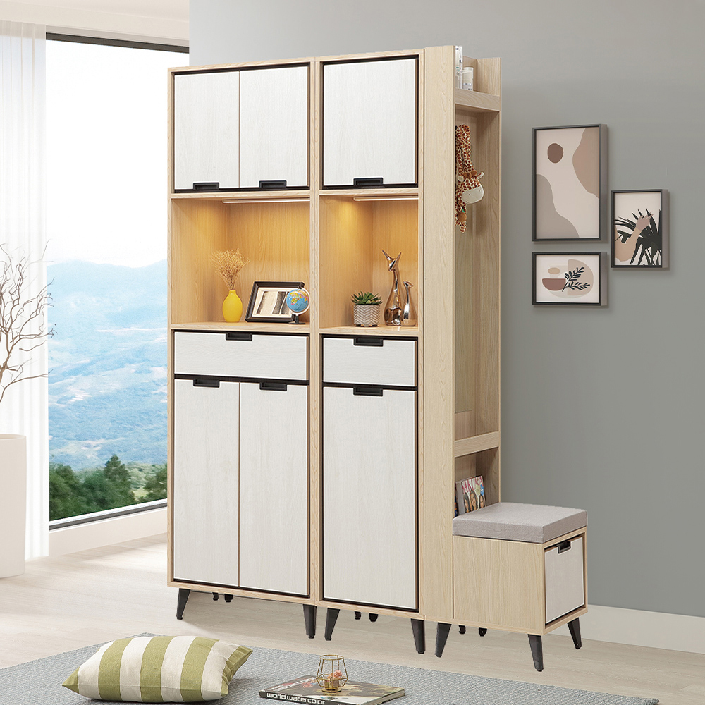 收納空間:鞋櫃使用封閉式門櫃能妥善收納全家人的鞋履、包包也能達到防塵效果;中段的暖光展示層與多用途抽屜,將隱蔽收納與美感展示完美平衡;右側貼心整合了穿衣鏡、掛勾與具備儲物功能的穿鞋椅,讓更衣整裝一氣呵成。