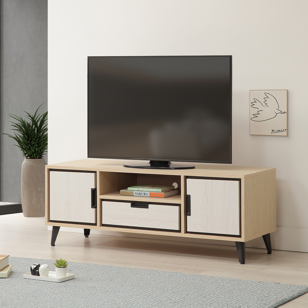 收納空間:中央設有開放式置物格,方便擺放影音設備;下方隱藏式抽屜,可收納遙控器、線材等零散雜物;左右兩側的櫃門則提供了充足的防塵儲物空間,讓您的視聽區整齊美觀,告別凌亂。