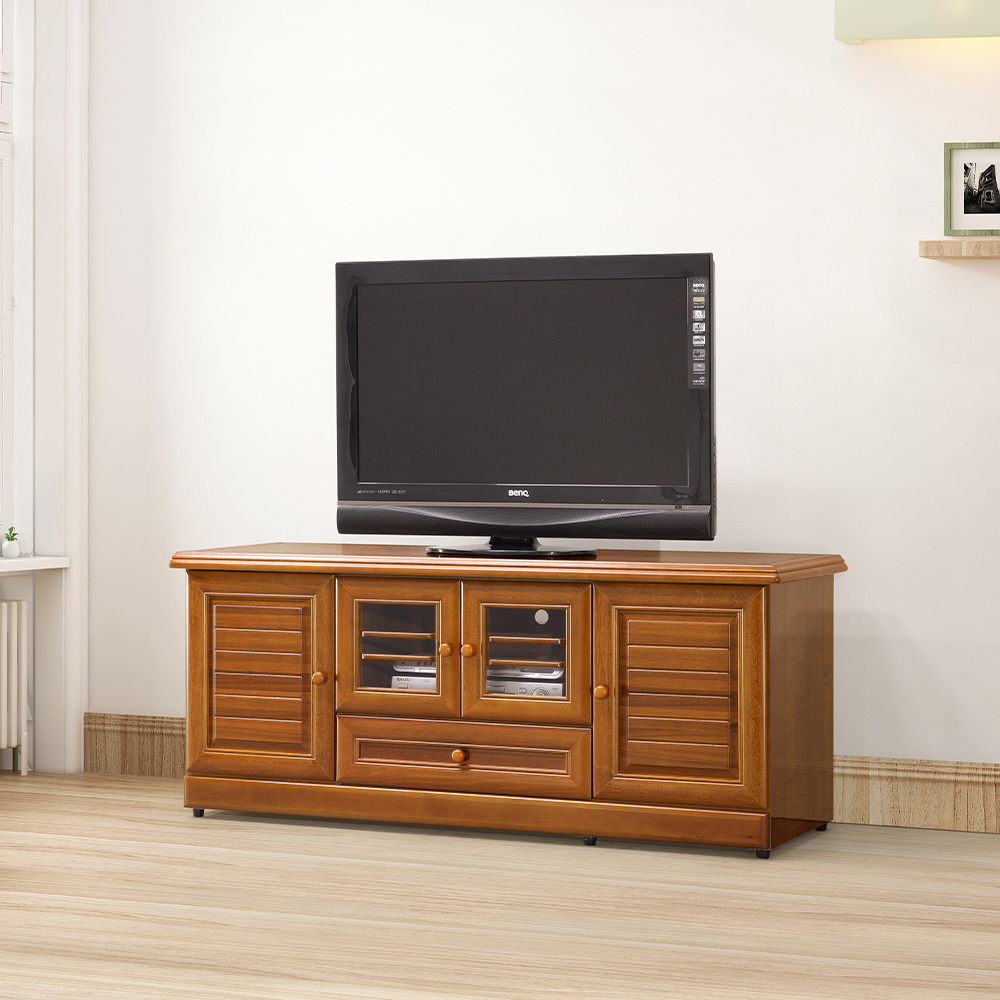 電視櫃設計:經典的柚木色,呈現如焦糖般溫潤飽滿的色澤。鑲嵌的通透玻璃門讓視覺輕盈不壓迫;櫃體邊緣與抽屜面板細緻的圓潤修邊,展現豐富的立體層次,再搭配古樸圓型木質把手,為厚實穩重的櫃體注入高貴而內斂的懷舊氣息。