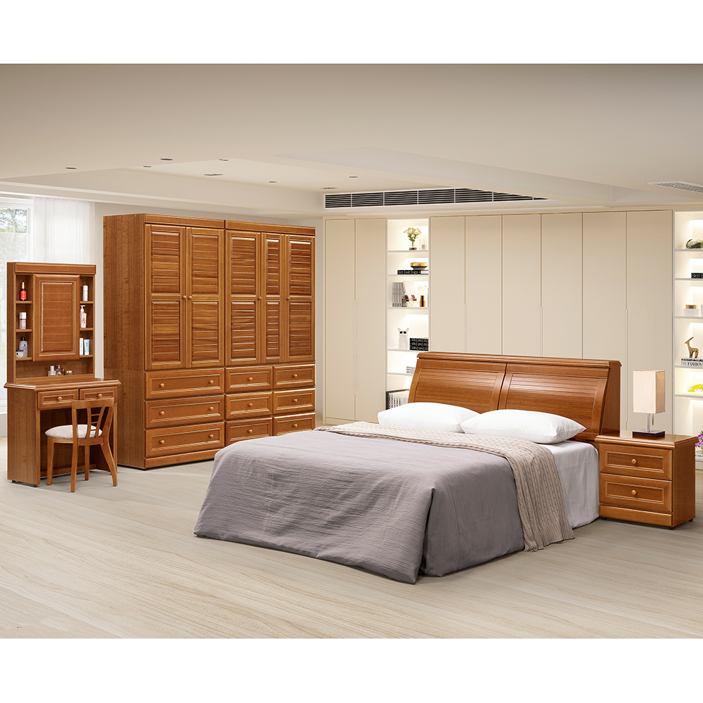 床頭櫃設計:溫潤的暖琥珀胡桃木色,漆面呈現如蜂蜜般細膩飽滿的光澤。抽屜面板採用立體浮雕框線勾勒出精緻的層次感,搭配造型圓潤的木質手把,在方正穩重中透出一絲柔和,呈現復古且歷久彌新的視覺感受。