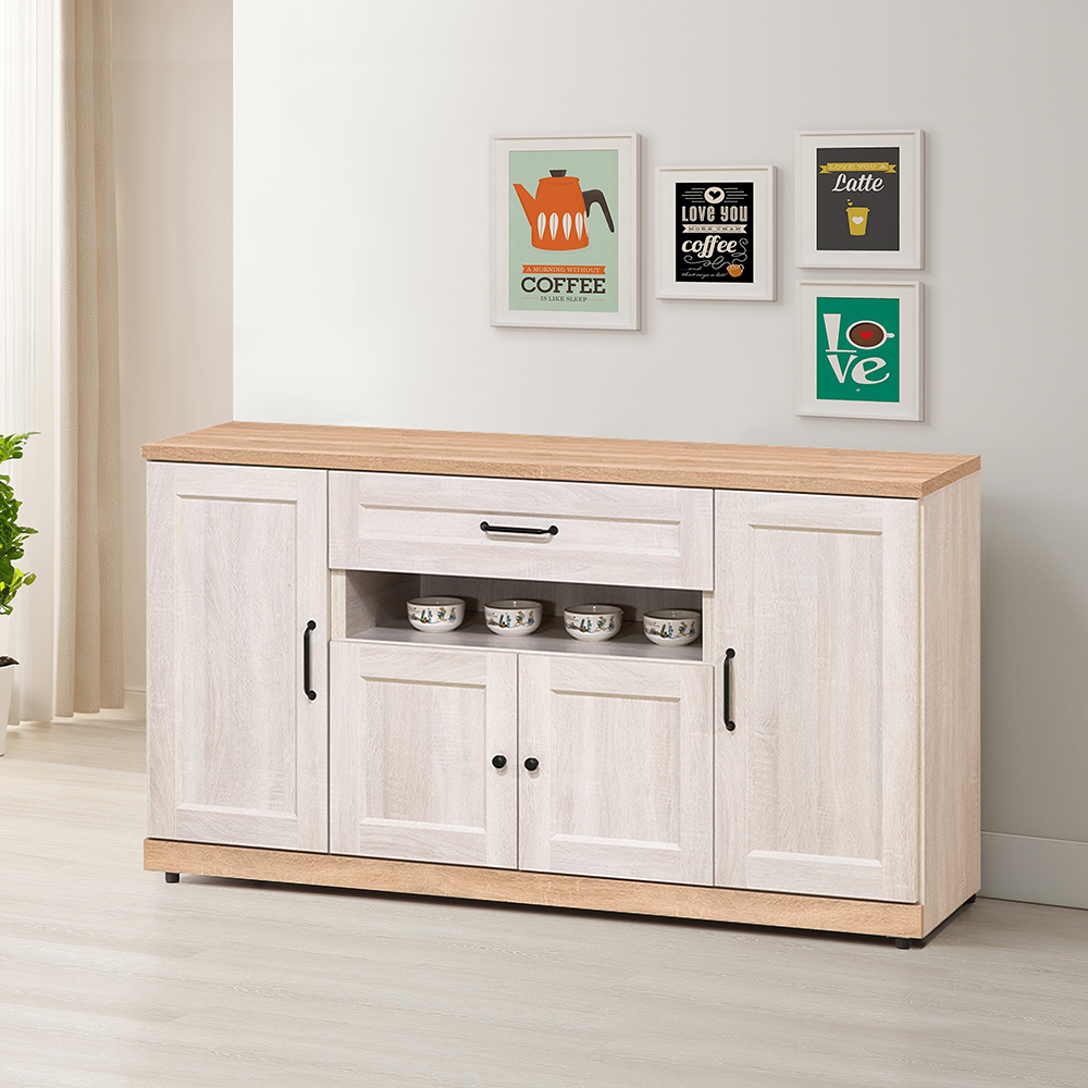 收納功能:餐櫃設有寬大的抽屜,適合放置餐具或零碎小物;門櫃內部設置活動隔板,可依家電或鍋具高度調整空間;中間的開放式格位則方便取用常用的馬克杯或小家電, 兼具隱蔽與開放兩種需求。