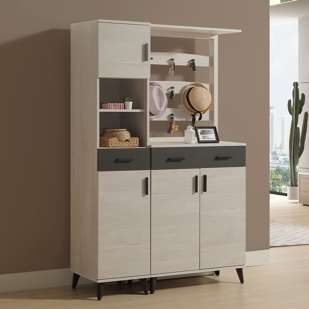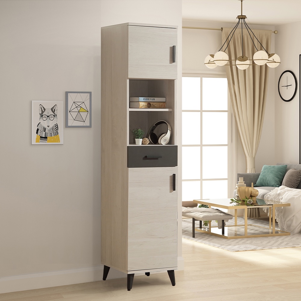 收納功能:頂層與底層的雙門櫃結構,不僅能完美隱藏日常雜物,底層門櫃內配置多層隔板還可依鞋履或物品高度靈活調整;中間開放式空間,方便隨手拿取耳機或書籍,搭配抽屜收納零碎小物,讓居家收納在保持隱私的同時,也兼具隨取隨用的便利性。