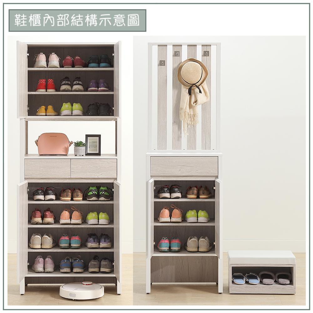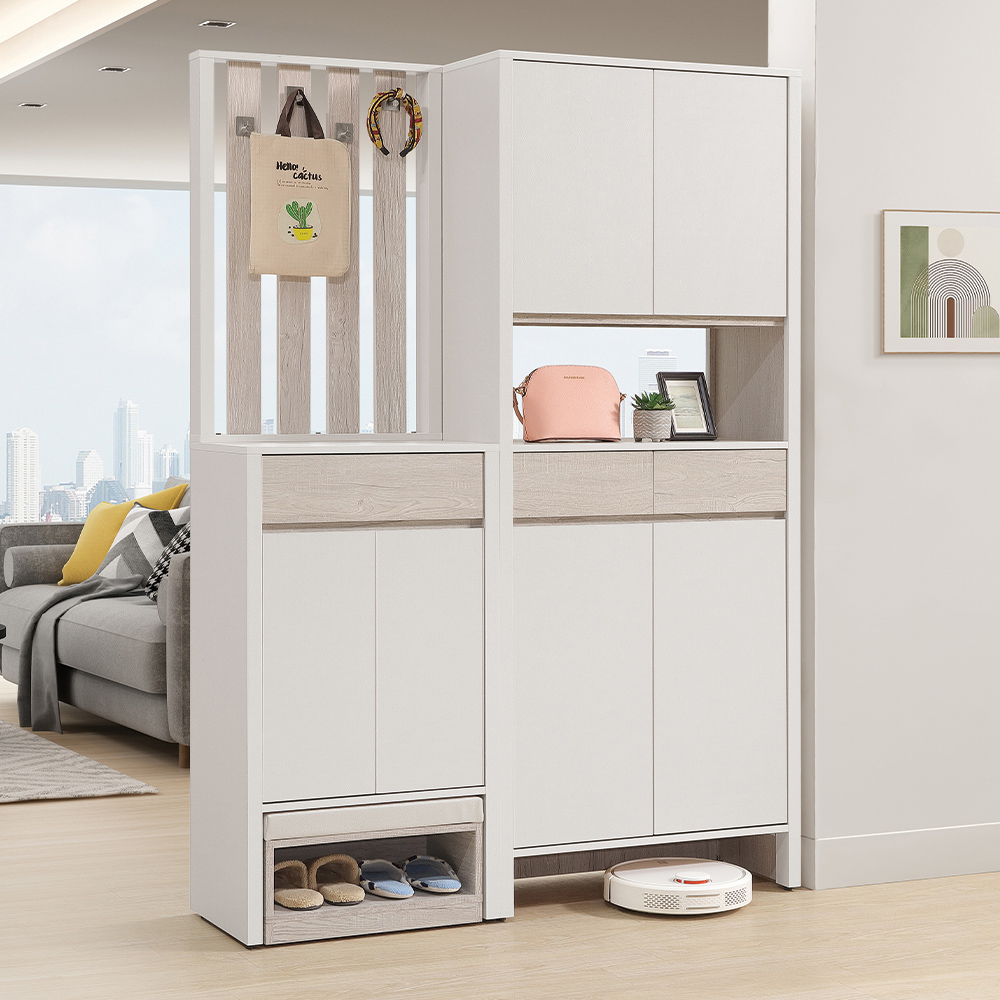 收納功能:多層活動式隔板設計,能彈性分類不同高度的鞋款;抽屜用於收納鑰匙等零散小物;中間開放式平台作為隨手置物或展示品擺放區;吊掛區及掛鉤,方便懸掛帽子、圍巾;底部則貼心預留掃地機器人或常用拖鞋的開放空間,實現井然有序、美觀與實用兼具的玄關機能。