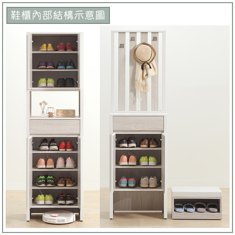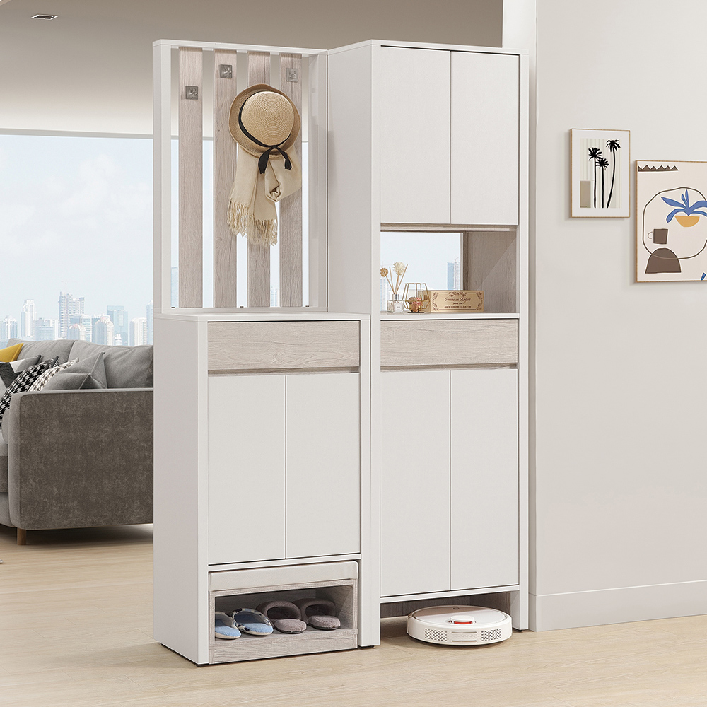 收納功能:多層活動式隔板設計,能彈性分類不同高度的鞋款;抽屜用於收納鑰匙等零散小物;中間開放式平台作為隨手置物或展示品擺放區;吊掛區及掛鉤,方便懸掛帽子、圍巾;底部則貼心預留掃地機器人或常用拖鞋的開放空間,實現井然有序、美觀與實用兼具的玄關機能。