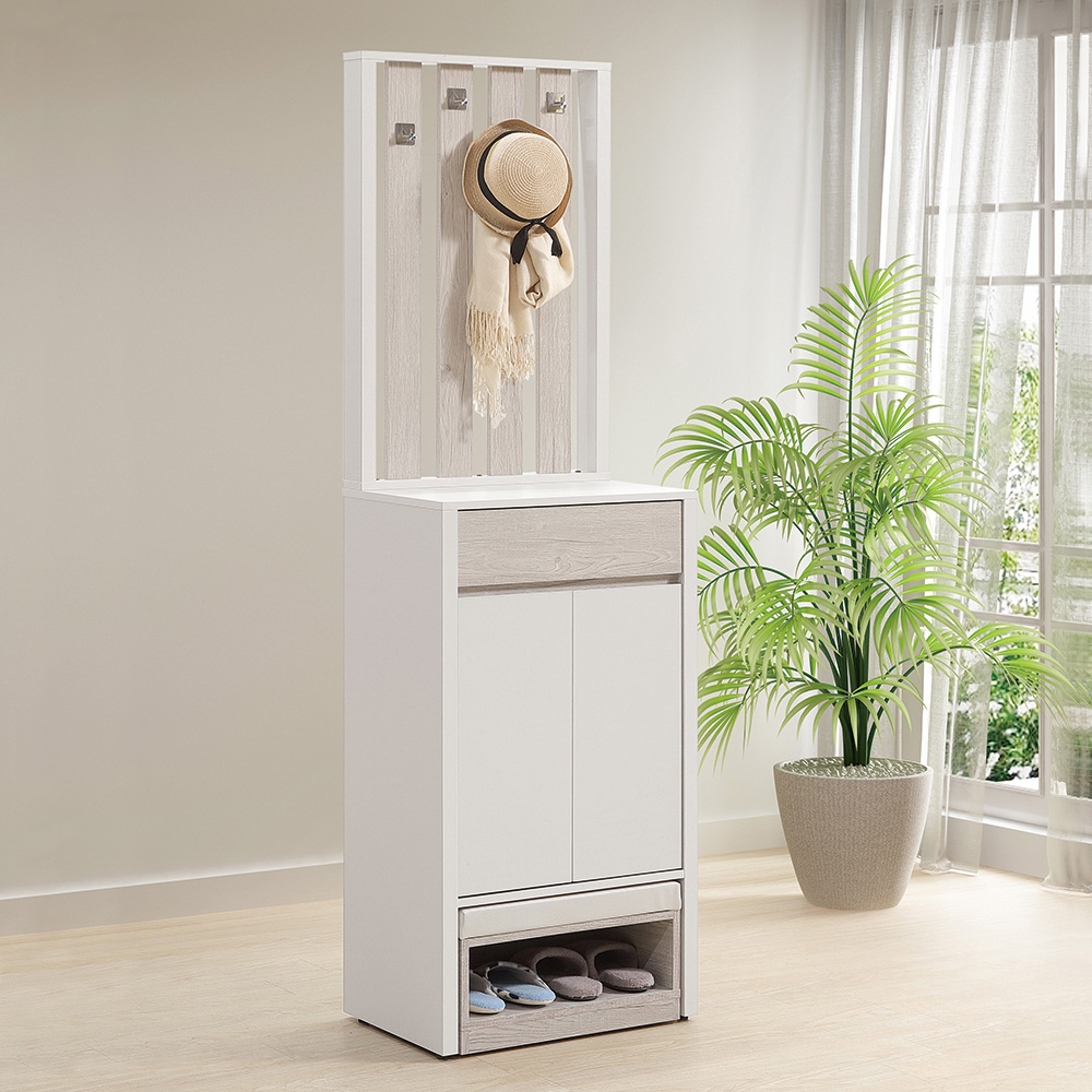 收納功能:上方的掛鉤區能吊掛帽子與圍巾等外出配件;中間抽屜是鑰匙或口罩等零碎小物的最佳位置;下方櫃門內提供多層隔板分類收藏鞋履,有效防塵;最底部的開放式穿鞋椅,可放置室內拖鞋,讓您的出入動線更加井然有序,從容不迫。