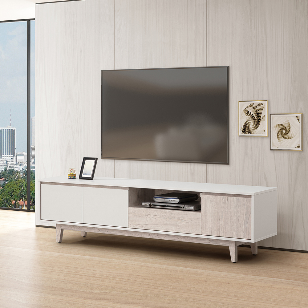 收納功能:電視櫃中央設有開放式層架,可放置影音播放器、機上盒或遊戲主機等設備;下方抽屜提供一個整潔的空間來收納遙控器、光碟或小型物品;左右兩側的門櫃內可用於收納書籍、文件或不常用的物品,視覺上實現了客廳的清爽與井然有序。