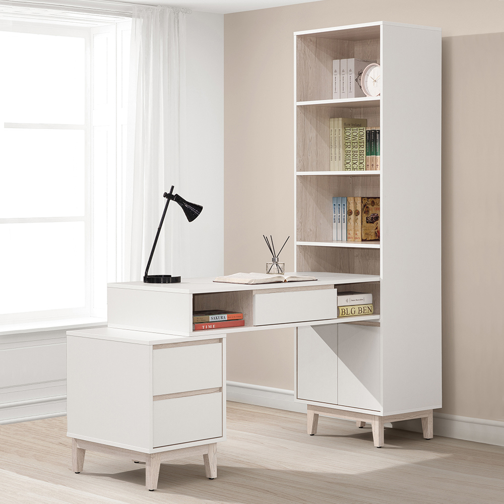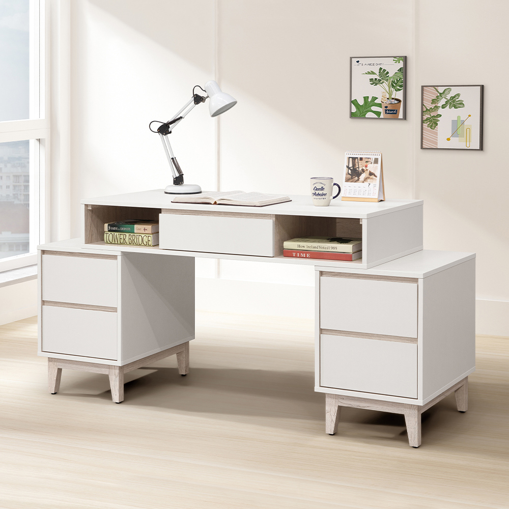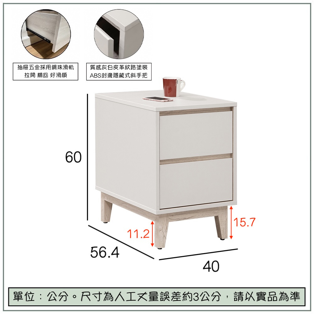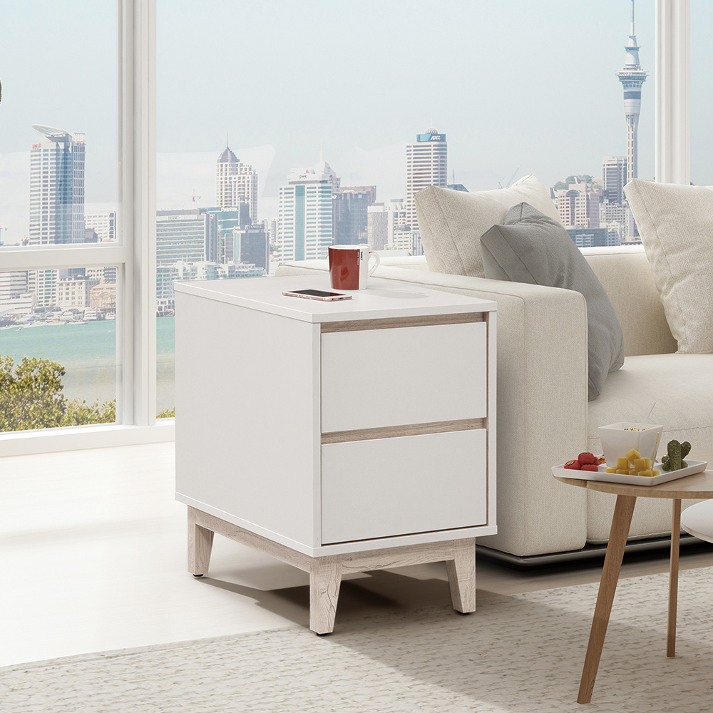 收納功能:配有雙層抽屜,上層可放置眼鏡、藥品等常用品,下層則適合收納書籍或私人物品;平整的檯面,可以放置檯燈、手機與水杯,讓所需的小物都能各就其位。