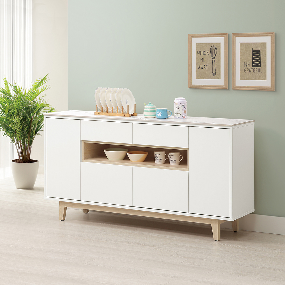 收納功能:抽屜適合存放餐具與零散小物;門櫃內部設有靈活隔板,能妥善隱藏各式碗盤、罐頭或茶包;中間的開放式層隔則提供了展示常用器皿或裝飾品的空間,讓收納不再單調,既實用又兼具視覺美感。