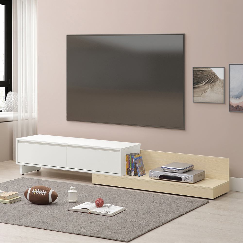 收納功能:櫃體採伸縮式靈活設計,可根據客廳空間自由調整長度,打破坪數限制。左側兩格大容量抽屜,方便收納遙控器、線材與各類生活雜物;右側延伸出的開放式平台,不僅能放置影音設備(如播放器、遊戲機),更是展示雜誌或藝術收藏的絕佳舞台。