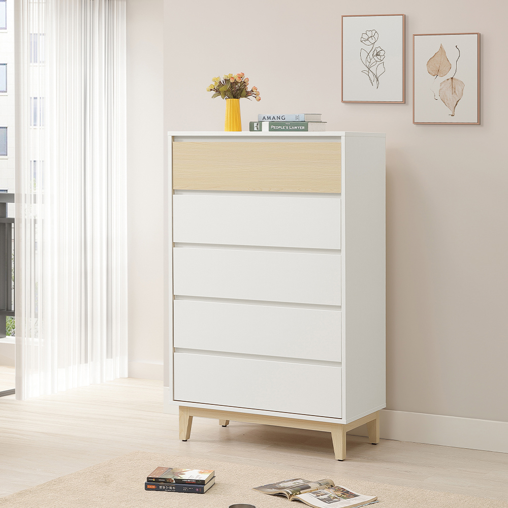 收納功能:五層抽屜式設計,提供充裕的分類空間,適合收納換季衣物、床單被套或生活雜物。分層式收納能有效將物品分門別類,讓居家空間告別凌亂,維持視覺的純淨感。
