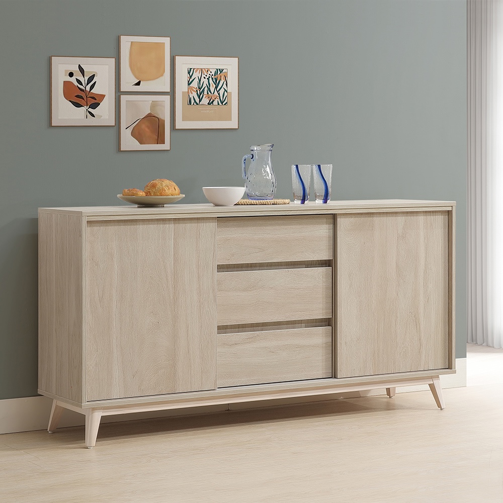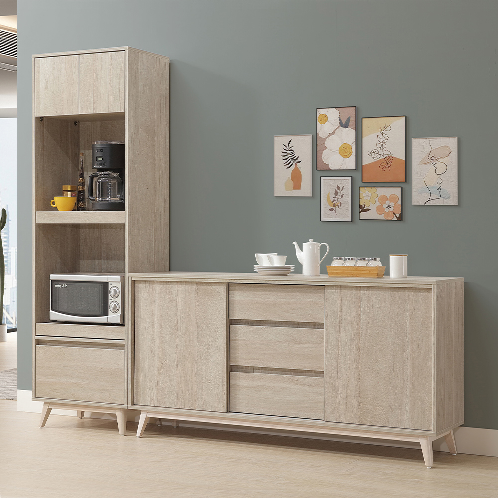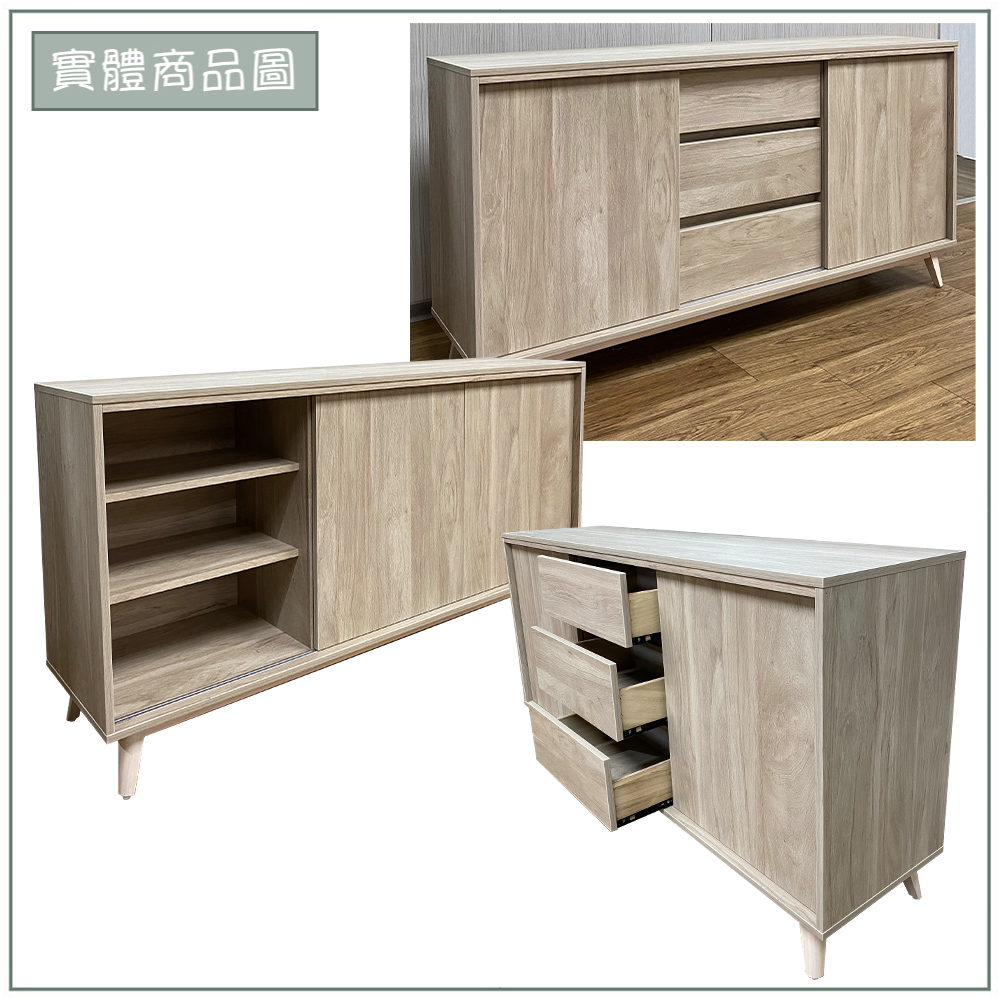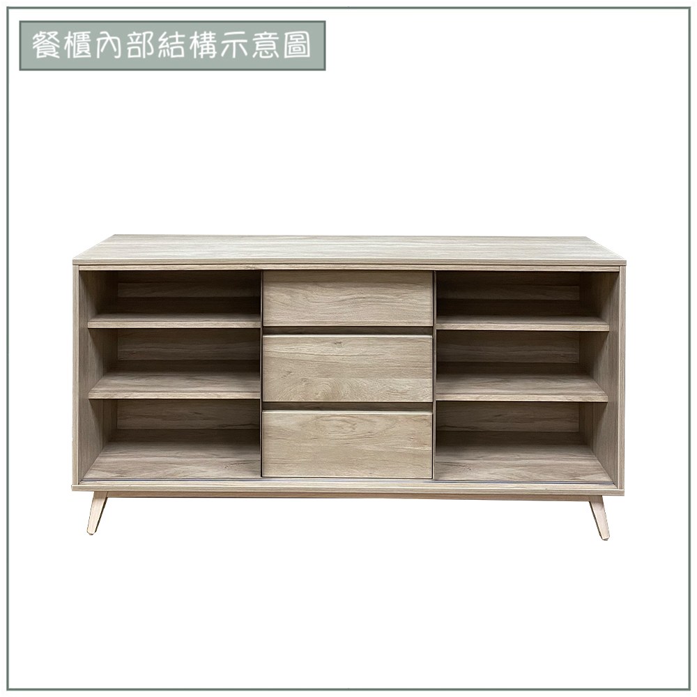 收納功能:中央配置三層獨立抽屜,適合存放餐具或日常瑣碎小物;左右兩側大容量層架空間,搭配滑門設計,不僅開關靈活、節省開門所需的空間,也能輕鬆放入鍋具與大型器材,讓收納更整齊。