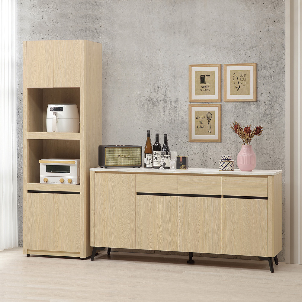 收納功能:雙層開放式抽屜托盤設計,能輕鬆擺放氣炸鍋、微波爐等常用電器,操作順手又易散熱;上下配置的雙開櫃門,能妥善收納乾貨、餐具與日常雜物,有效防塵並維持視覺整潔,聰明整合展示與收納機能,是小空間實用的收納幫手。