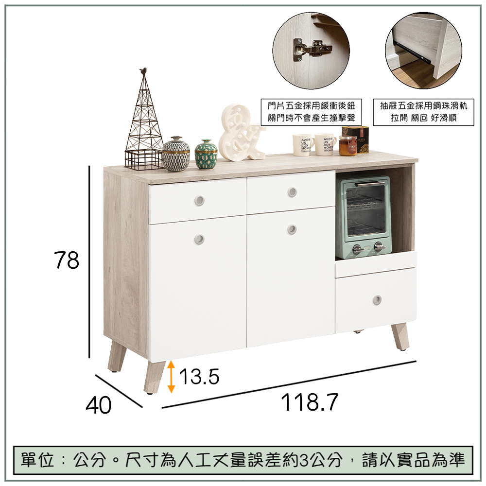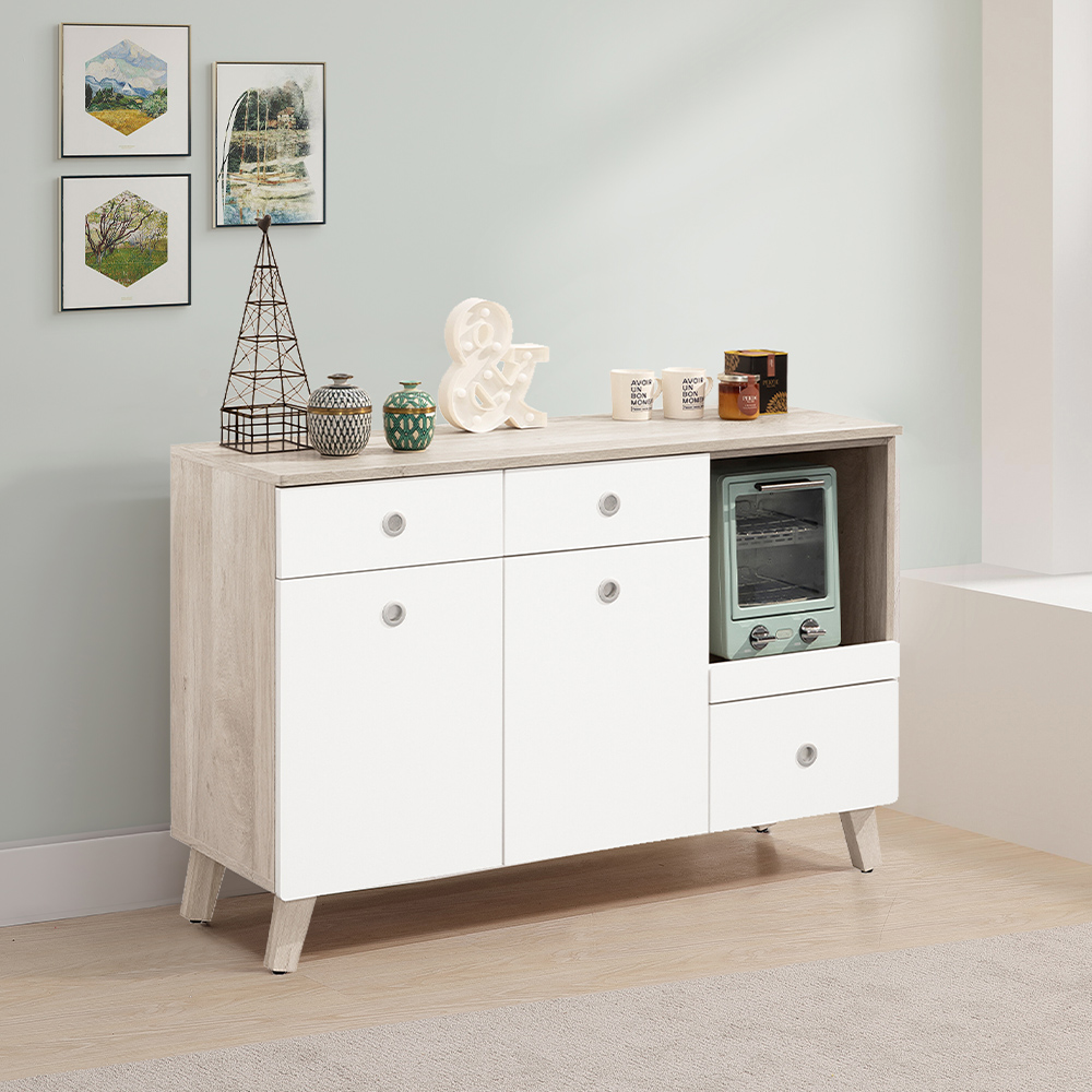 收納功能:開放式托盤抽屜搭配背板電線孔,烤箱或咖啡機可即插即用;抽屜可細分刀叉及日常雜貨;櫃門內配置活動隔板,可依鍋具高度自由調整,將凌亂廚房備品化為整齊有序的生活景致。