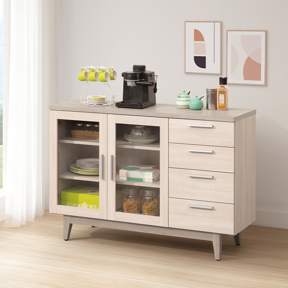 收納功能:玻璃門櫃內配置可調式層板,輕鬆放置大型餐盤或料理小家電,靈活創造收納與展示空間;右側四層抽屜,適合分類存放餐具、桌巾或日常雜物;簡潔大方的檯面設計,輕易化身私藏的午茶角落,讓日常收納與生活品味優雅並存。