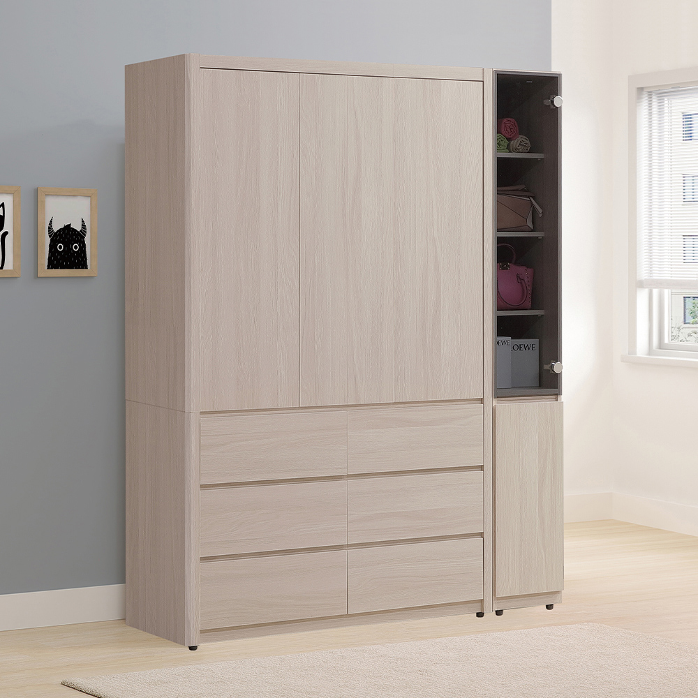 多樣化收納空間:吊衣區可以掛襯衫、洋裝、外套等需要保持平整的衣物,防止產生皺摺;下方抽屜櫃適合收納折疊的衣物,也可以使用收納盒整理襪子、貼身衣物等物品;玻璃門的空間可以展示珍藏包包、飾品等,增加空間層次感。結合了吊衣區、層板展示格和多個抽屜,滿足多種收納需求。