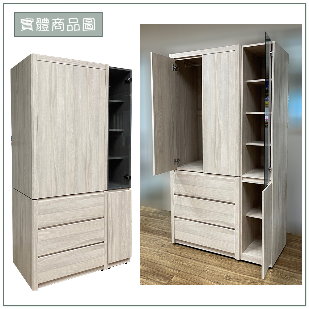 多樣化收納空間:吊衣區可以掛襯衫、洋裝、外套等需要保持平整的衣物,防止產生皺摺;下方抽屜櫃適合收納折疊的衣物,也可以使用收納盒整理襪子、貼身衣物等物品;玻璃門的空間可以展示珍藏包包、飾品等,增加空間層次感。結合了吊衣區、層板展示格和多個抽屜,滿足多種收納需求。