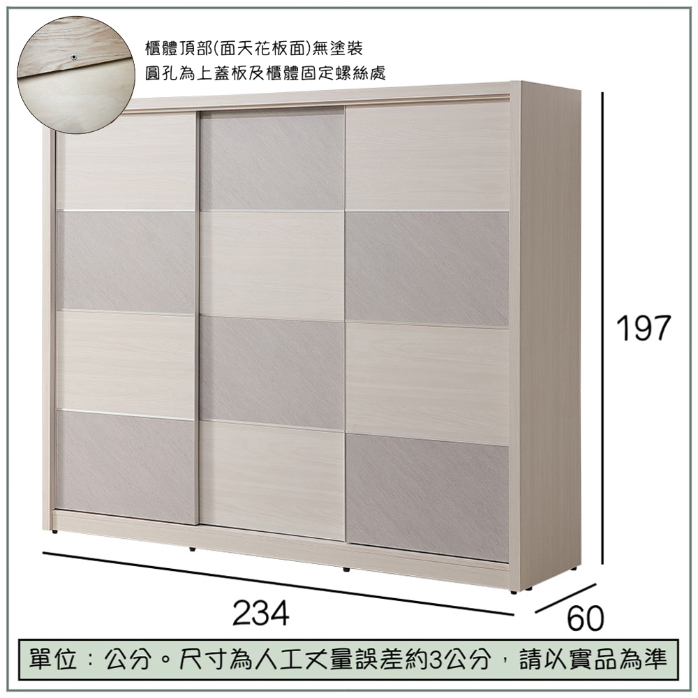 衣櫃設計:以溫潤的霧白橡木色為基調,搭配岩灰色美耐皿板點綴,形成多層次的視覺感。三門滑門開合順暢,收納更靈活,衣物、大型寢具或行李箱都能有條不絮的安放。