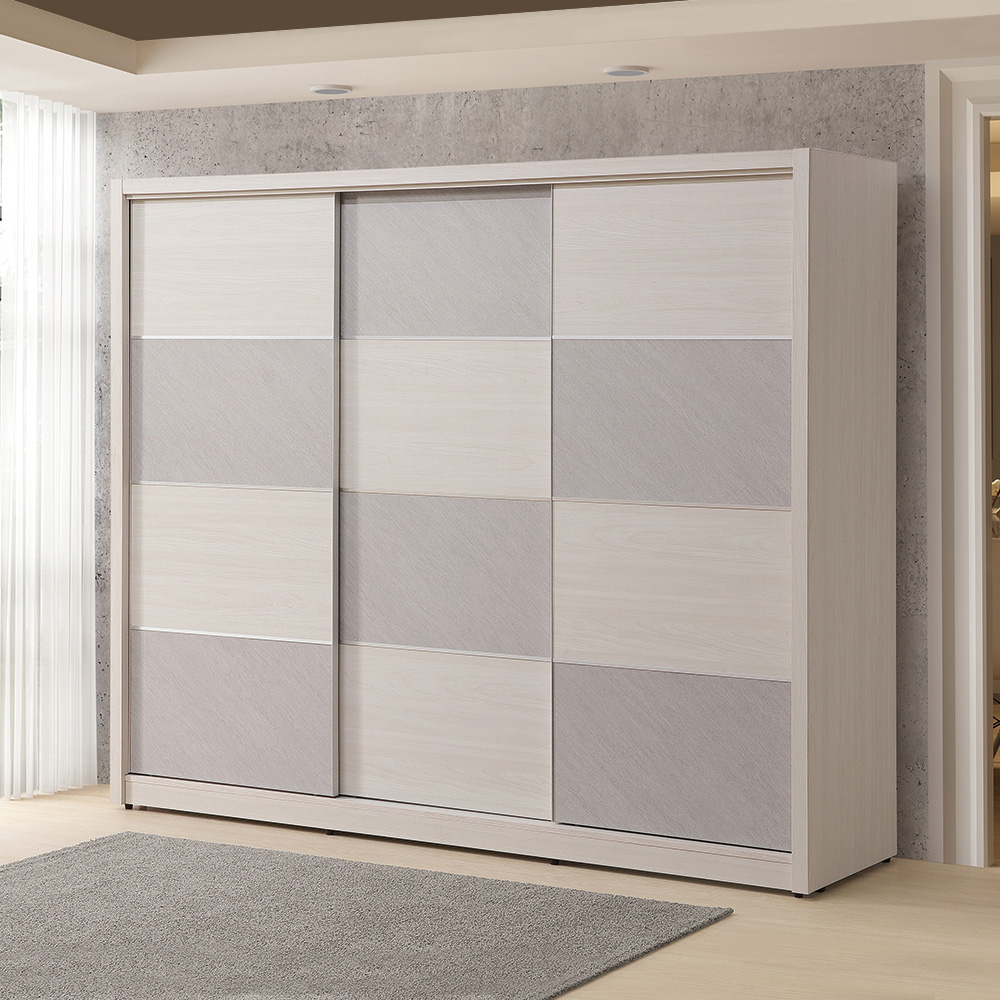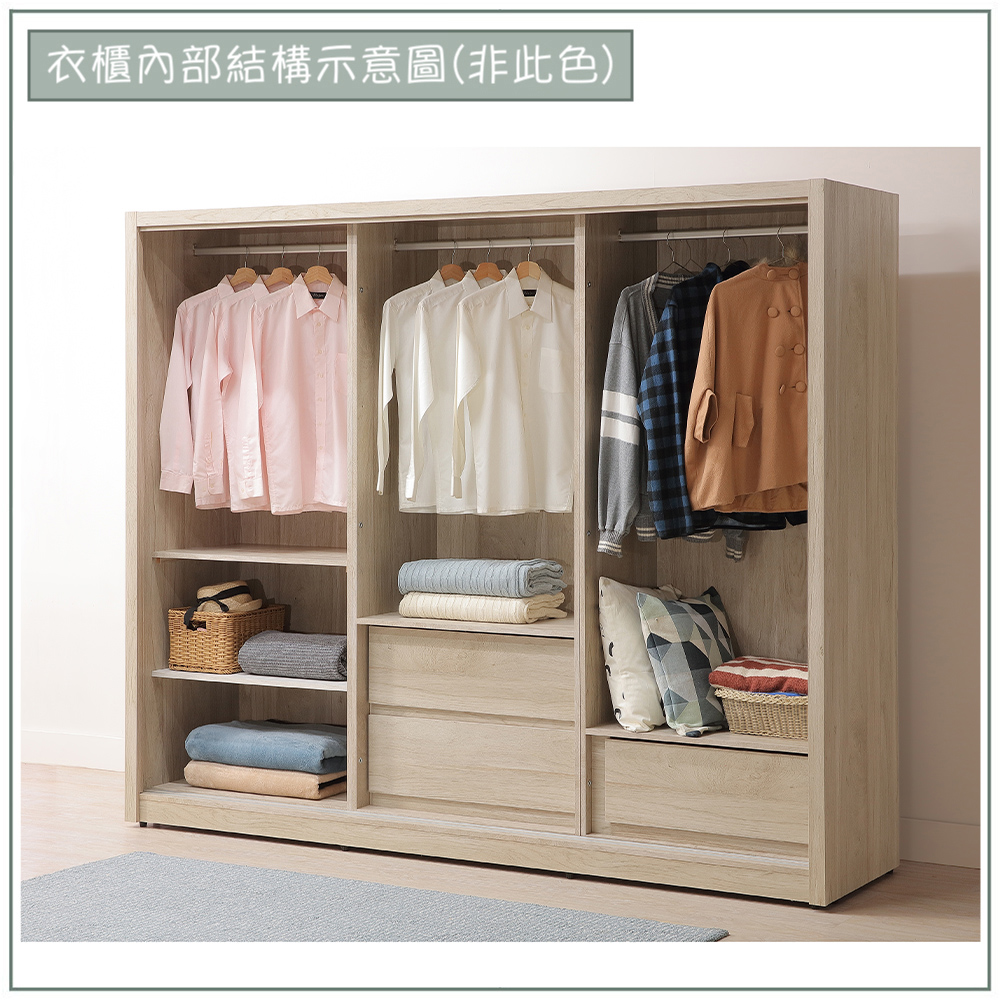 收納空間:三門設計搭配滑順軌道,輕鬆開闔不佔空間。左側上層吊衣區可以掛襯衫、短外套或行李箱,下層開放格可以摺疊毛衣、棉被等大型寢具;中間及右側吊衣區可以掛長洋裝、大衣等需要保持平整的衣物,防止產生皺摺,下方抽屜櫃方便收納折疊的衣物、襪子或貼身衣物等,讓空間更加整潔有序。