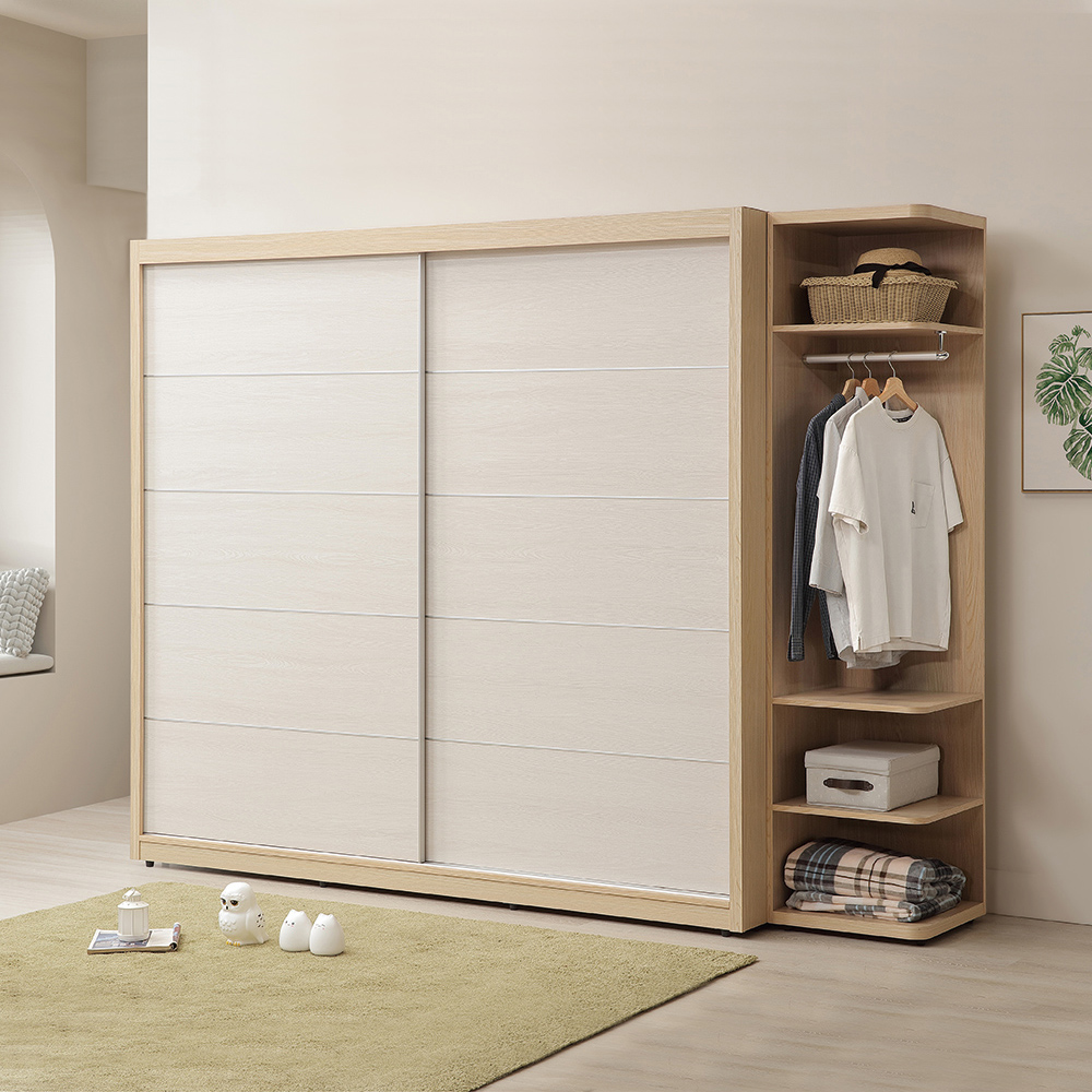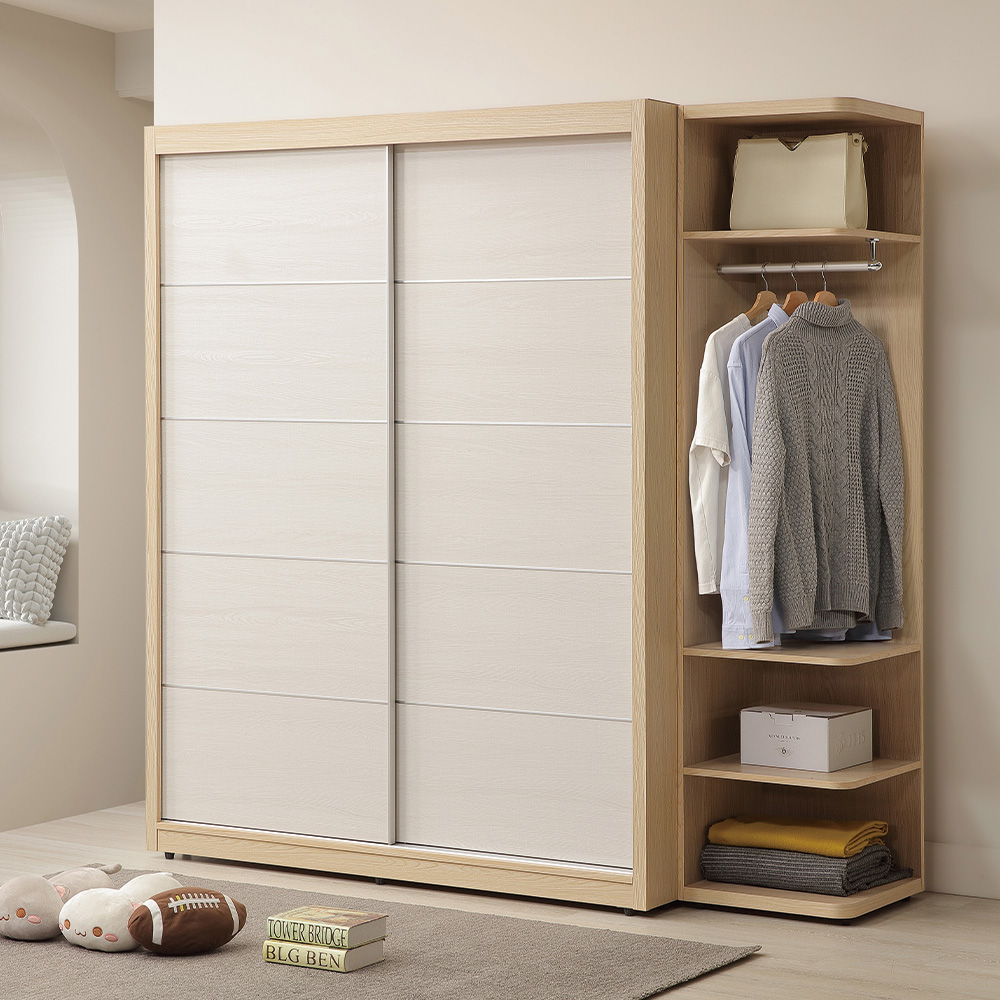 收納空間與設計:提供四層的靈活空間,上方可展示帽子與收藏;中層掛衣區可以吊掛經常穿搭的外套或大衣;底部則能搭配收納籃,隱藏零碎雜物。原木色轉角衣櫃採用開放設計打破櫃體沉悶感,圓弧導角設計兼顧美觀與防撞安全,完美活化角落空間,視覺通透輕盈。