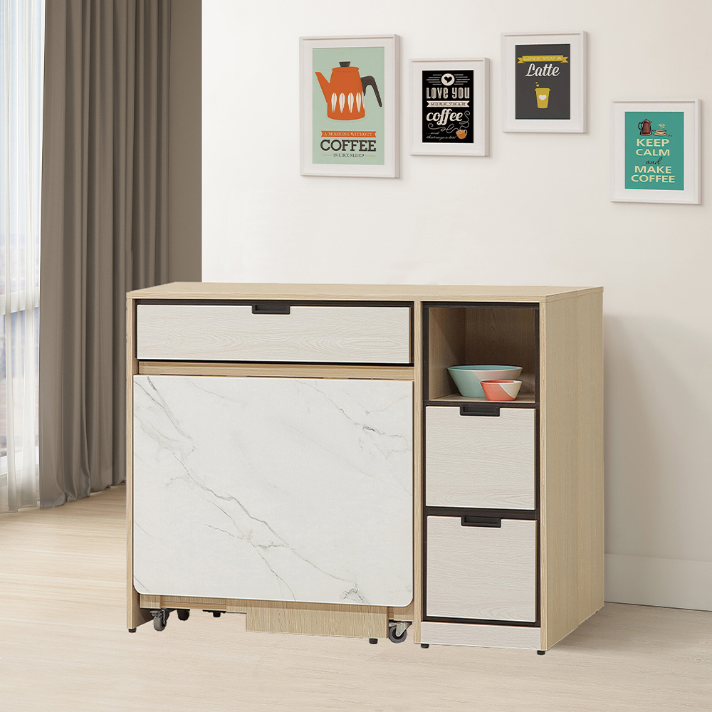 餐櫃設計:以溫暖的原木雙色為主,搭配仿大理石紋桌面,質感優雅。其變形設計能在櫃體與餐桌間快速切換,視覺清爽,完美提升小空間美學。