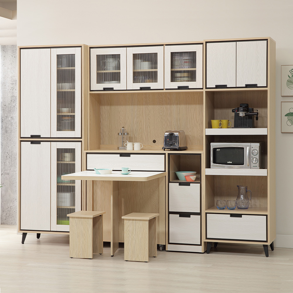 收納空間: 檯面可作為備餐或電器工作區;下方提供三格抽屜,方便分類收納零散餐具;核心亮點是左側的折疊餐桌,收合後能將四張方凳完全隱藏於桌體內部,完美解決小空間的餐椅收納問題,實現零死角的空間利用。