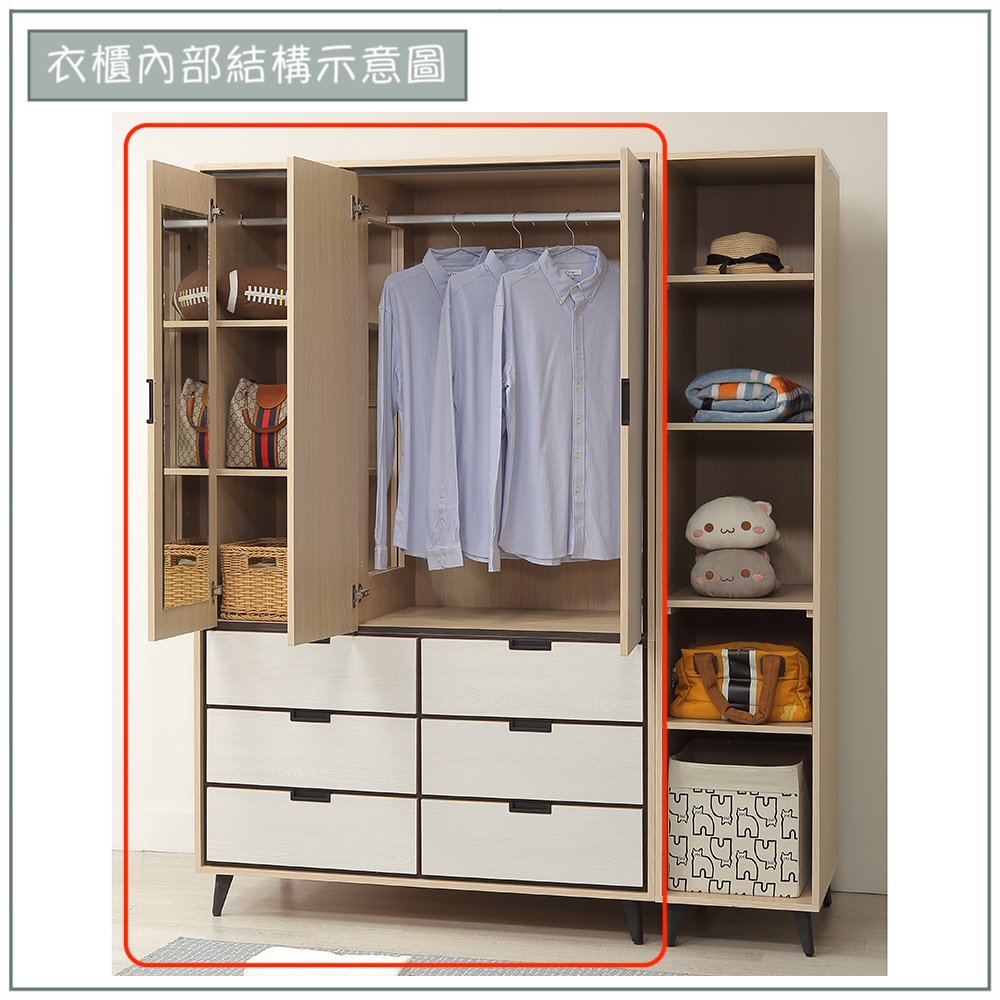 收納空間:雙邊掛衣區+六大抽屜,能同時容納大衣、襯衫、小物、包包與日常更換用品;門片內側附有全身穿衣鏡,整理服裝更方便,從大件到小物皆有固定位置,讓整體收納更加有序、好管理。