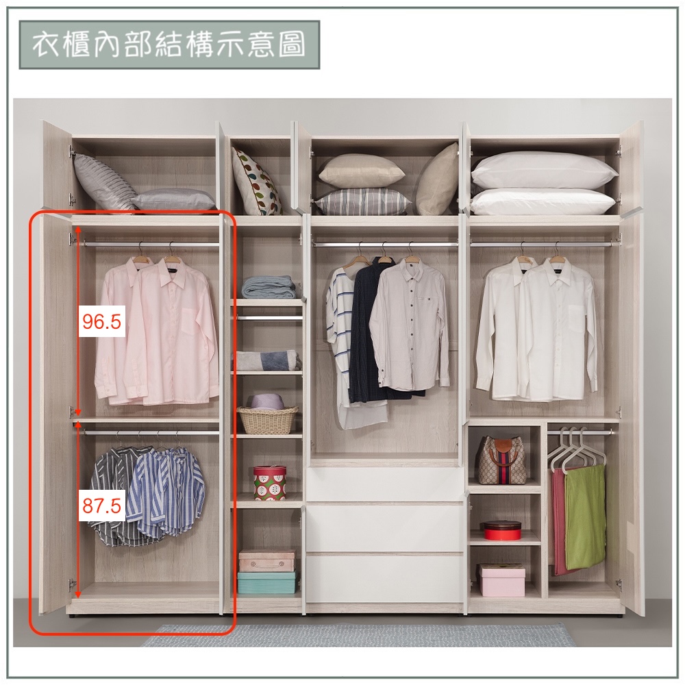 收納功能:高效能的雙層吊掛系統,上層專門為長版大衣、洋裝及風衣提供垂直懸掛環境;下層則配置給日常襯衫、短外套和裙裝。吊掛式可防止衣物產生皺痕,也能讓分類一目瞭然,實現快速選取與穿搭的從容。