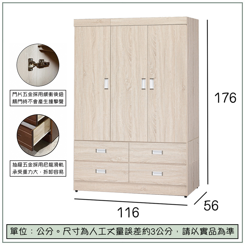 收納功能:以三門空間劃分,右側內部配置穩固掛衣桿,適合吊掛襯衫、大衣等易皺衣物;左側則規劃可拆式吊衣桿與活動層板,無論是摺疊衣物、包包或收納盒,都能依需求自由調整。下方設有四格抽屜,方便分類收納貼身衣物、配件與換季衣物,讓日常整理更有條理。
