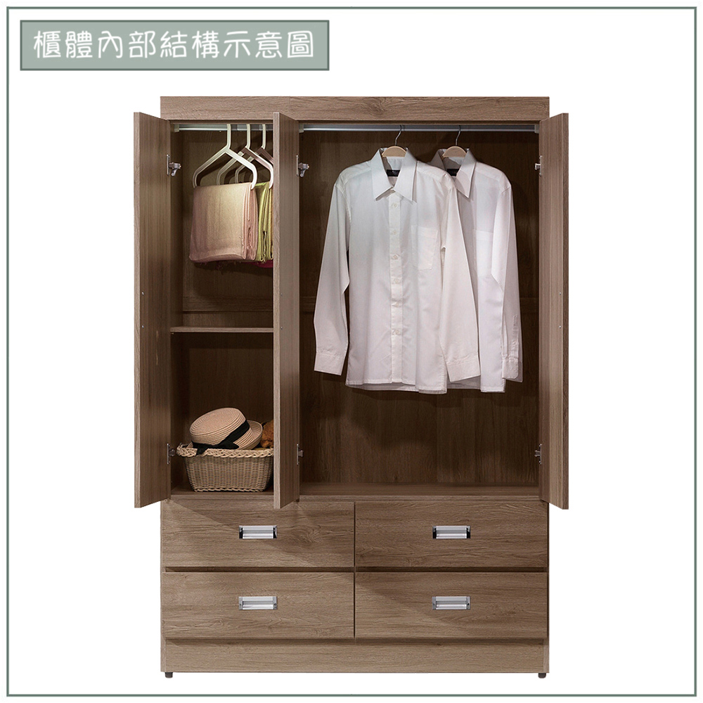 收納功能:以三門空間劃分,右側內部配置穩固掛衣桿,適合吊掛襯衫、大衣等易皺衣物;左側則規劃可拆式吊衣桿與活動層板,無論是摺疊衣物、包包或收納盒,都能依需求自由調整。下方設有四格抽屜,方便分類收納貼身衣物、配件與換季衣物,讓日常整理更有條理。