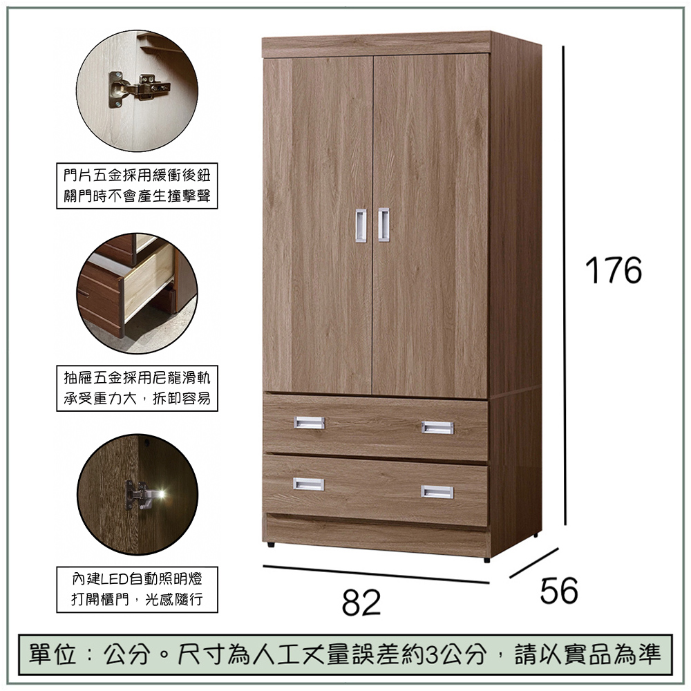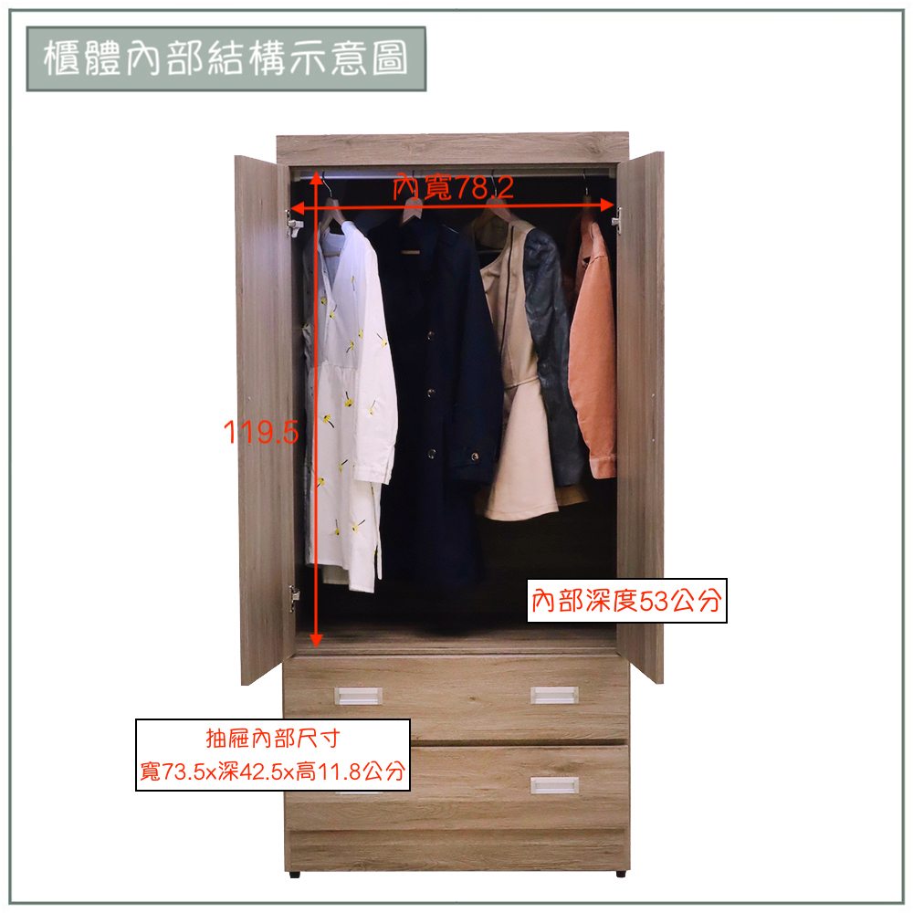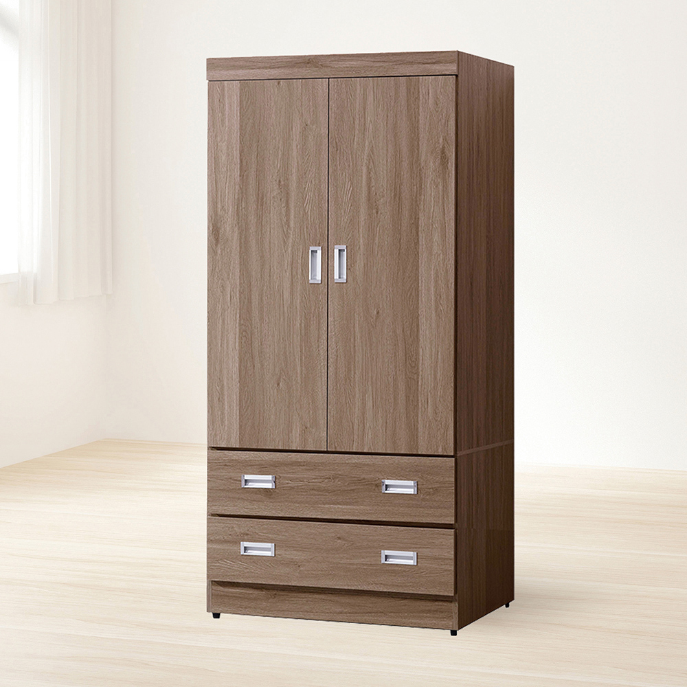 收納功能:上方雙開門空間寬敞,適合懸掛大衣、襯衫或長裙,有效防止衣物皺褶;下方配置兩層抽屜,方便分類收納摺疊衣物、貼身配件或日常雜物,讓空間運用更加靈活,滿足全方位的儲物需求。