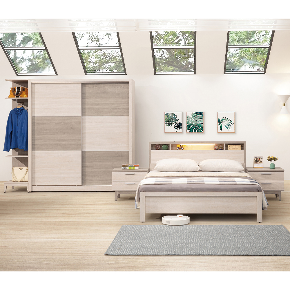 收納功能:利用床頭板的厚度提供置物機能,適合擺放鬧鐘、香氛、書籍或手機;最貼心的是配置了柔和 LED 氣氛燈條,提供睡前閱讀的微光,也省去了額外添購檯燈的空間與電線雜亂感,實現整潔的睡眠環境。
