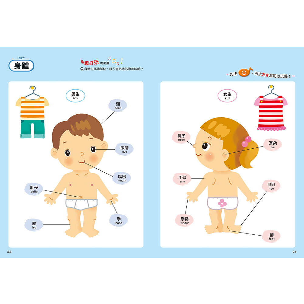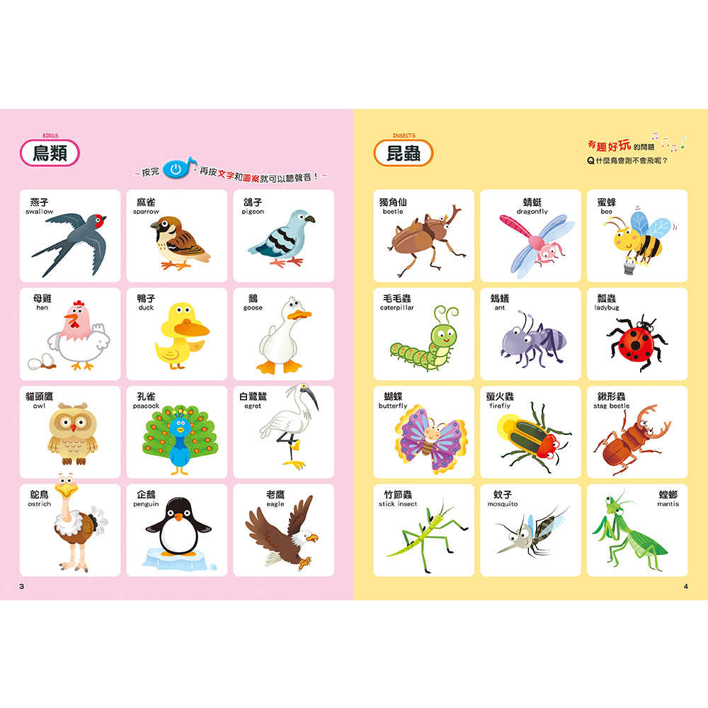 用「手指」點一下圖片或文字,就可以聽到單字發音;說完單字後,還會有一句簡單的敘述,可增進幼兒的認知廣度。「視覺+觸覺+聽覺」的多重感官學習方式,幼兒更容易吸收,學習效果更棒!