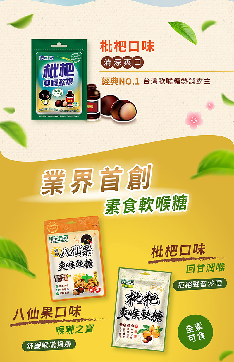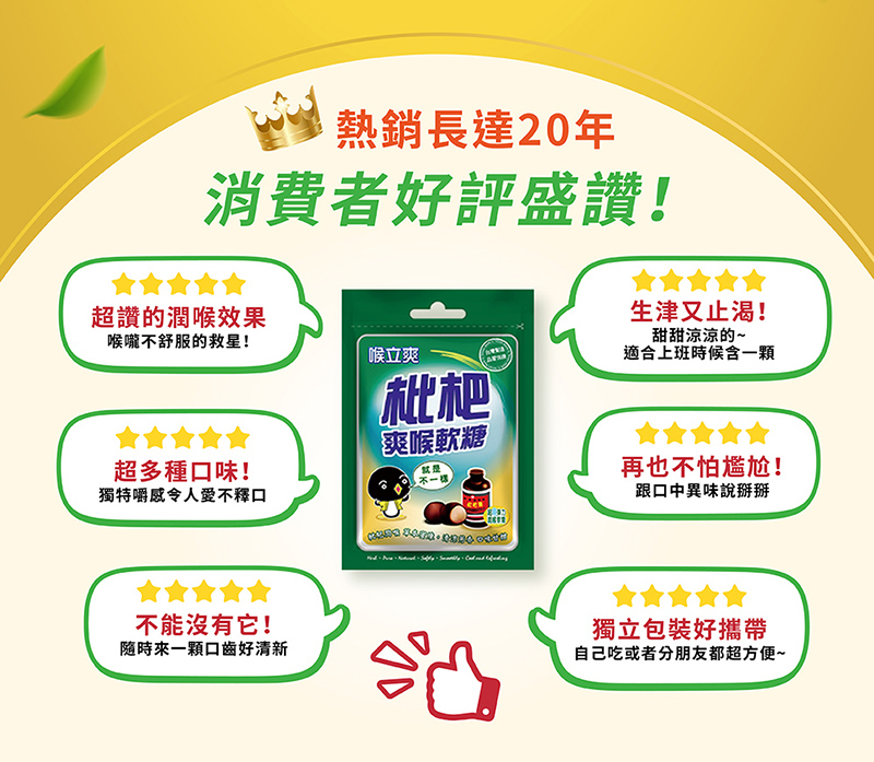 ◉喉立爽是針對忙碌的現代人所研發出口感特別的軟糖,特選數十種天然珍貴草本潤喉植物精煉,能快速達到爽聲潤喉的作用。無論是您唱歌、演講、抽菸、喝酒或喉嚨不適,隨時食用喉立爽,讓您喉嚨達到潤喉爽聲,清新舒暢。