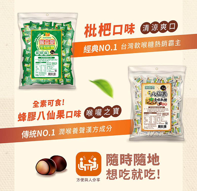 ◉喉立爽是針對忙碌的現代人所研發出口感特別的軟糖,特選數十種天然珍貴草本潤喉植物精煉,能快速達到爽聲潤喉的作用。無論是您唱歌、演講、抽菸、喝酒或喉嚨不適,隨時食用喉立爽,讓您喉嚨達到潤喉爽聲,清新舒暢。