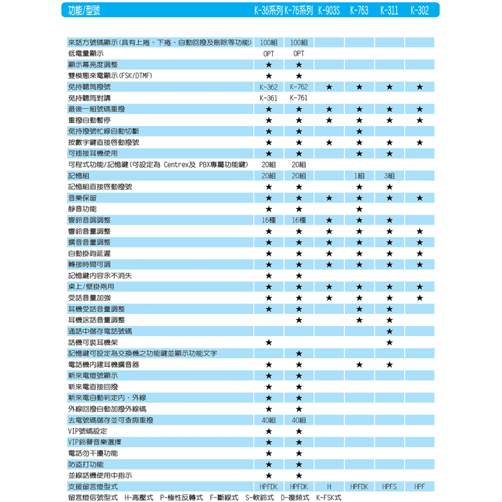 具來電顯示功能(FSK/DTMF 雙模),可動態儲存最多100組來電號碼