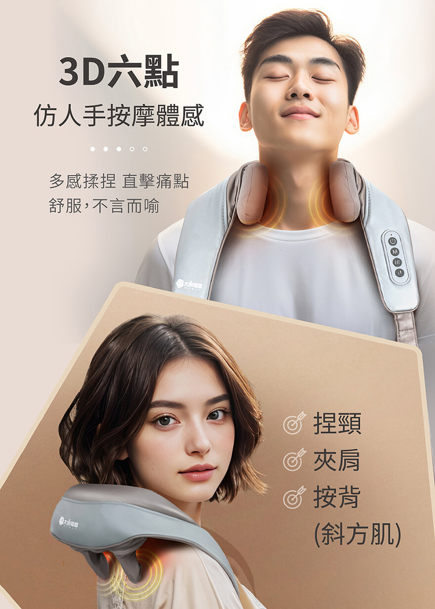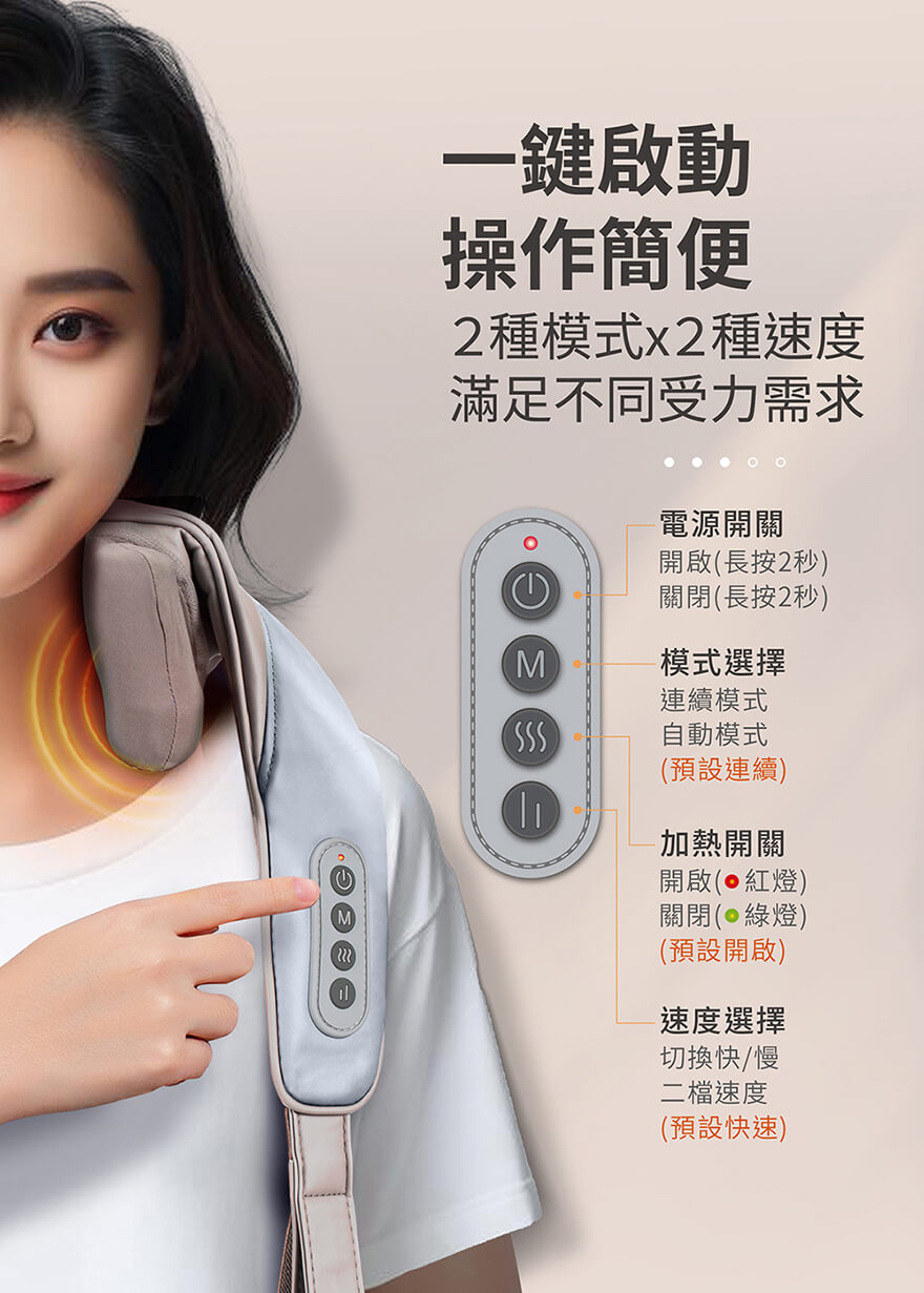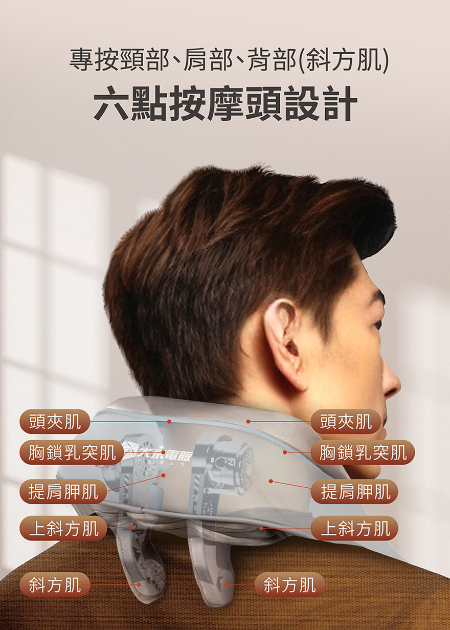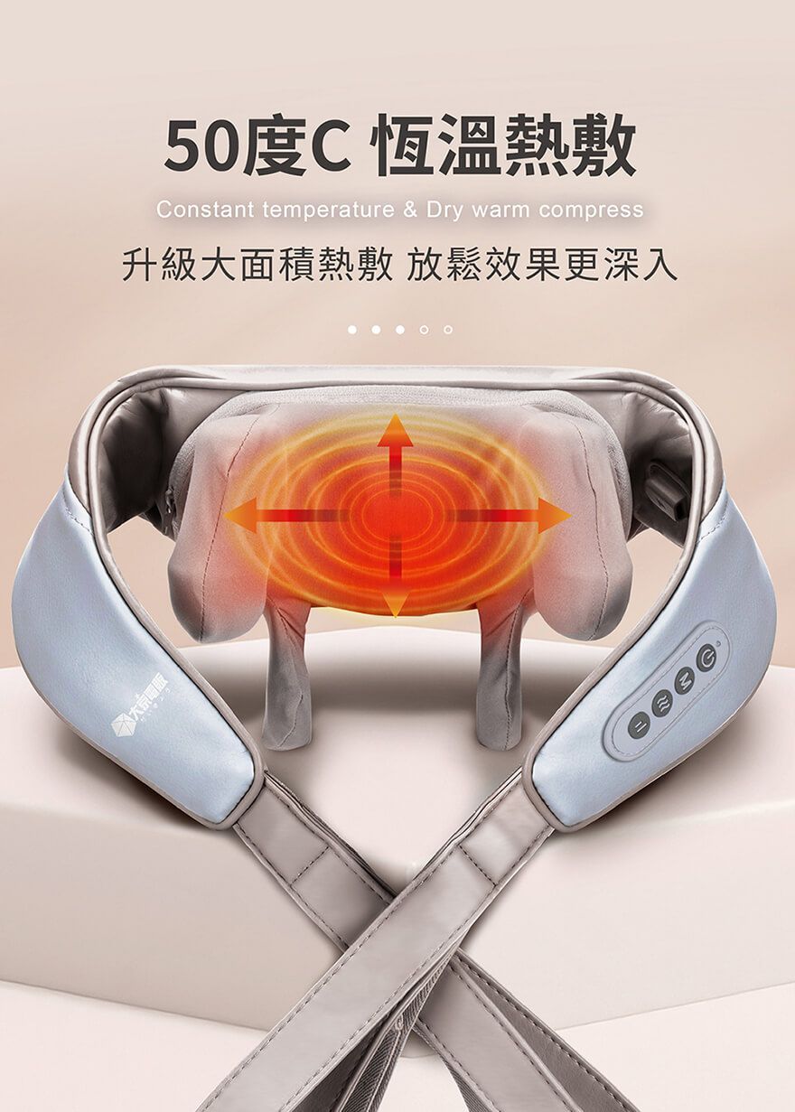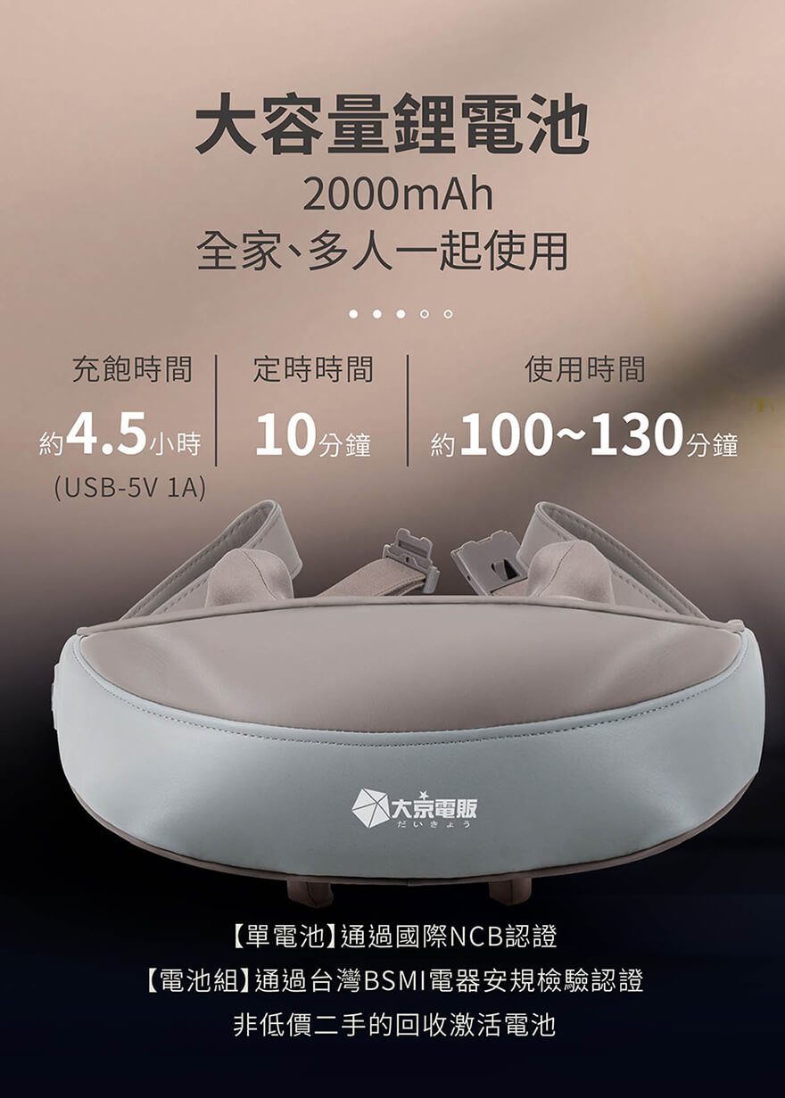 產品型號:BY060037A產品名稱:【DAJING 大京電販】無線免手持/充電式肩頸按摩帶產品顏色:幻影灰產品尺寸:長33cm*寬51cm*高17cm產品重量:1.2kg±5%(不含配件)電池容量:2000 mAh鋰電池連續使用時間:100~130分鐘(10~13次)定時停止時間:10分鐘充電電壓/接口:5V / TYPE-C充飽電時間:約4.5小時 (以5V 1A充電計算)TYPE-C充電線長:101cm±2%※(BLDC直流無刷馬達)※保護機制:充電時無法使用包裝內容:主機x1、TYPE-C充電線x1、說明書x1商檢字號:R53615製造產地:中國(台灣設計)專利證號:D230991(期限 20240421~20270420)於購買日期(或製造日期)起算365日內,非人為不當使用的新品故障瑕疵維修,由本公司派車【免費來回收送】維修,所產生的費用由本公司全額負擔。(限台灣本島內收送)產品在正常使用範圍內,享有自購買日期(或製造日期)起算12個月內,產品零件免費維修更換的保固服務。※建議定期擦拭外部皮套,高級PU皮革肩帶可使用皮革保養乳或一般乳液擦拭。※符合有下列所述時,請勿使用或是在專業醫師指導下使用:1.孕婦、骨質疏鬆症患者、使用心臟起博器者。2.高血壓、心臟病、腦動脈化硬化、腦血栓患者。3.使用中有胸悶、呼吸不順或其他不適症狀時,請立即停止使用。.4.飯後30分鐘內。5.重傷初癒或剛開完刀,身體尚未復元或身體有傷口者。6. 按摩器有加熱功能,熱感覺遲緩者,使用時需有人員在旁協助,密切注意。