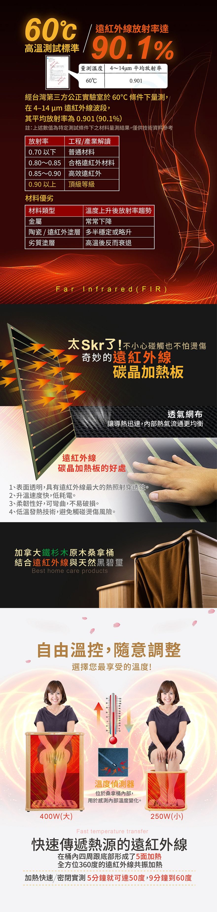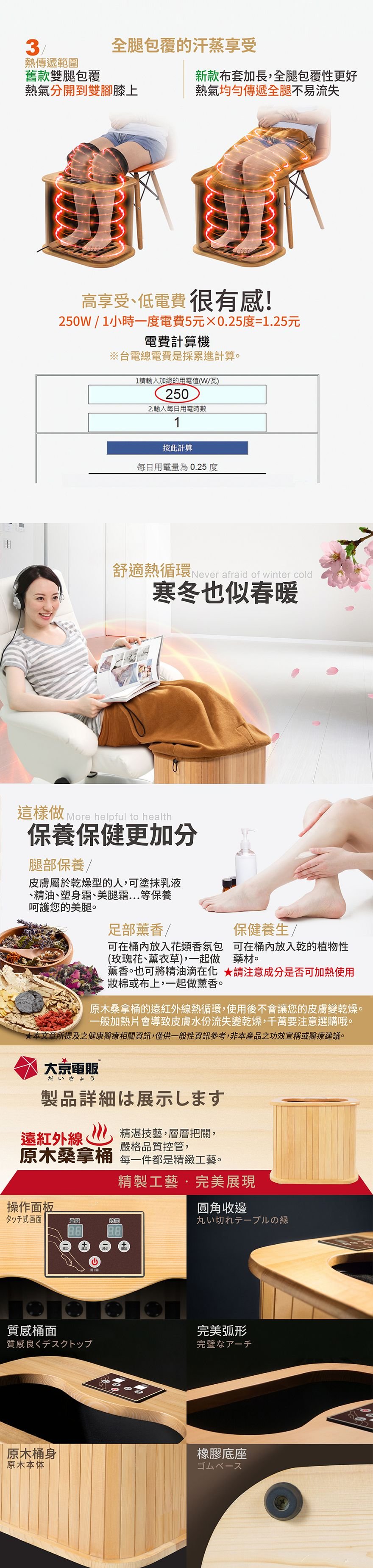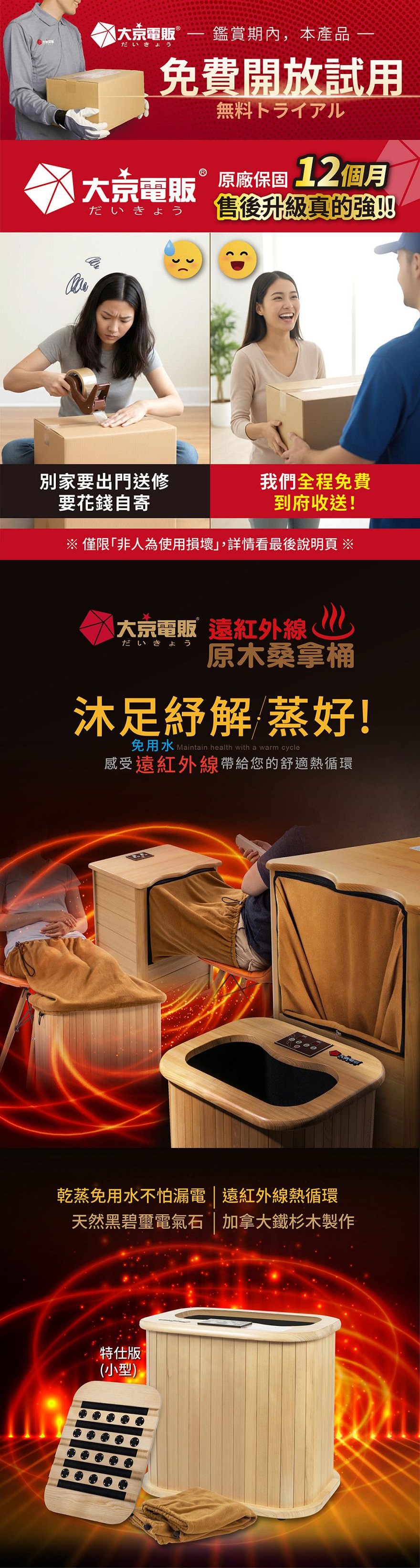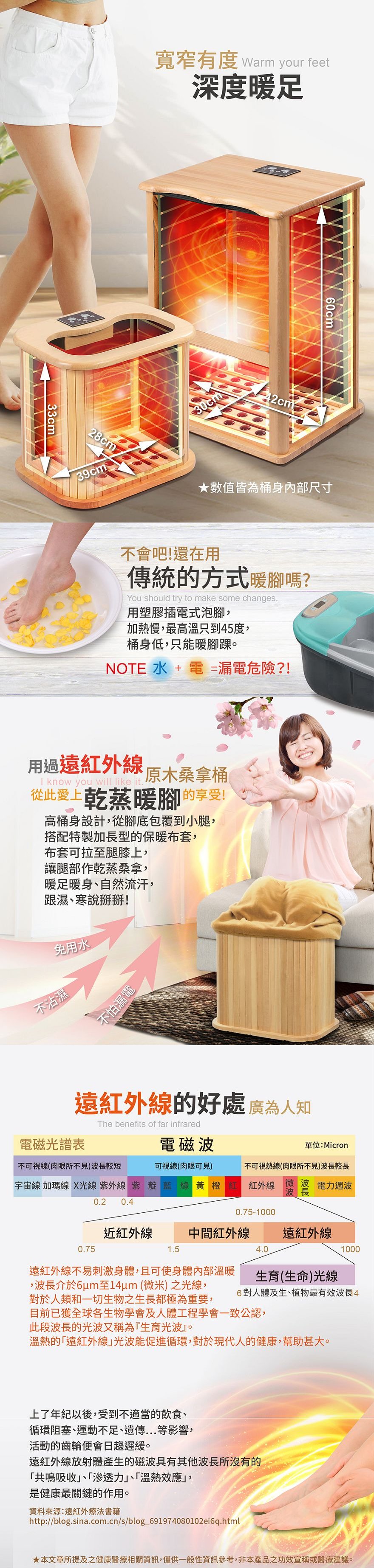 產品型號:BY010078A產品名稱:【大京電販】遠紅外線加熱原木桑拿桶-特仕版小型桶身:長45cm x 寬34cm x 高40cm ±5%可拆裝加長型布套:長59cm x 寬69cm±5%電源線:250cm±5%整機重量:5.2 Kg±5% (含可拆裝加長型布套)主要材質:加拿大鐵杉木+遠紅外線碳晶板使用電壓:AC 110V /60HZ消耗功率:250W商檢字號:R53615製造產地:中國 包裝內容物:桑拿桶主商品x1 +可拆裝單口布套x1+說明書(含保卡)x1符合有下列所述時,請勿使用或是在專業醫師指導下使用:1、孕婦。2、使用中有胸悶、呼吸不順或其他不適症狀時,請立即停止使用。3、飯後30分鐘內。4、重傷初癒或剛開完刀,身體尚未復元。※ 請保持產品本體的乾燥,請勿在浴室或潮濕處使用;本產品請勿使用在頭部和傷口處。※ 鑑賞期內如需退換貨,商品本身、贈品、包裝彩盒均務必保持完整齊 。
