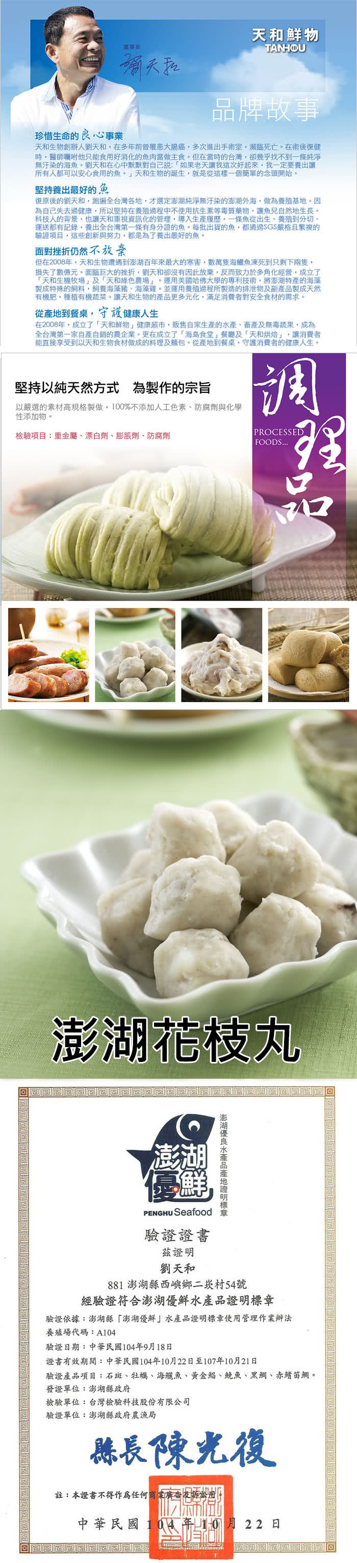 內容物:澎湖花枝丸7包淨重、容量或數量:300公克 /包成分:新鮮花枝、海藻豬油、太白粉、鹽、糖有效期限:-18℃冷凍保存1年〈未開封〉,開封後請儘早食用完畢適用年齡:3歲以上食用方式:冷藏解凍後,可煎食用皆宜保存方式: 低溫冷凍配送商品原產地(國家):台灣澎湖廠商廠商或國內負責廠商:天和鮮物股份有限公司地址:台北市忠孝東路五段689號8樓電話:02-87858986食品業者登錄字號:X-180422045-00001-7