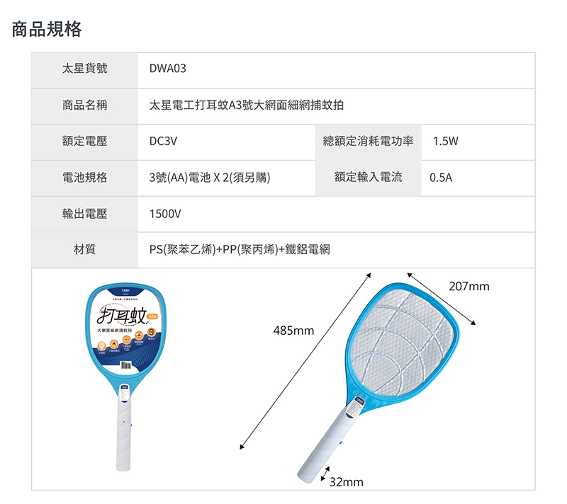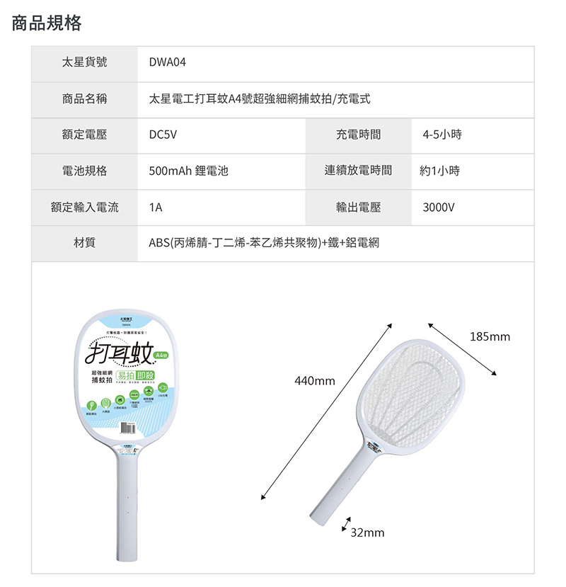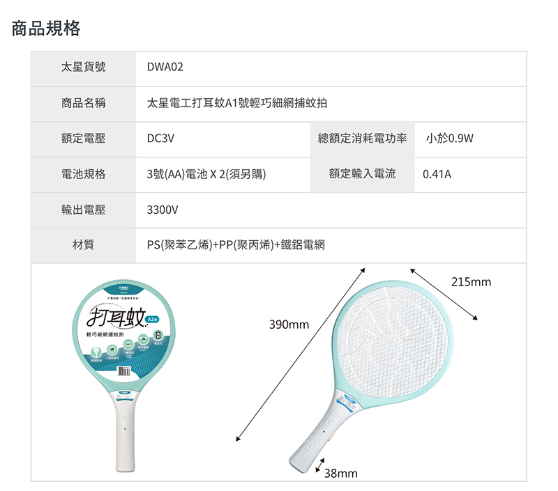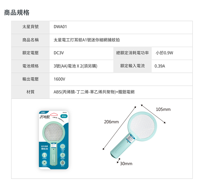 ◆商品規格與尺寸(A4)商品尺寸:(高)44x(寬)18.5x(深)3.2/公分商品包裝:(高)49x(寬)22.5x(深)3.2/公分商品重量:0.2kg包裝重量:0.25kg額定電壓:DC5V電池規格:500mAh 鋰電池充電時間:4-5小時連續放電時間:約1小時額定輸入電流:1A輸出電壓:3000V材質:ABS(丙烯腈-丁二烯-苯乙烯共聚物)+鐵+鋁電網網面:21x16cm原產地:中國數量:2入裝◆商品規格與尺寸 (A3)商品尺寸:(高)48.5x(寬)20.7x(深)3.2/公分商品包裝:(高)52x(寬)28.7x(深)3.2/公分商品重量:0.2kg包裝重量:0.22kg額定電壓:DC3V電池規格:3號(AA)電池 X 2(須另購)總額定消耗電功率:1.5W額定輸入電流:0.5A輸出電壓:1500V材質:PS(聚苯乙烯)+PP(聚丙烯)+鐵鋁電網網面:22x18cm驗證登錄:免檢商品原產地:中國數量:3入裝◆商品規格與尺寸 (A2)商品尺寸:(高)39x(寬)21.5x(深)3.8/公分商品包裝:(高)42.5x(寬)25.5x(深)3.5/公分商品重量:0.17kg包裝重量:0.19kg額定電壓:DC3V電池規格:3號(AA)電池 X 2(須另購)總額定消耗電功率:小於0.9W額定輸入電流:0.41A輸出電壓:3300V材質:PS(聚苯乙烯)+PP(聚丙烯)+鐵鋁電網網面:20.5x19.3cm驗證登錄:免檢商品原產地:中國數量:3入裝◆商品規格與尺寸 (A1)商品尺寸:(高)20.6x(寬)10.5x(深)3/公分商品包裝:(高)26.5x(寬)13.2x(深)3.5/公分商品重量:0.06kg包裝重量:0.11kg額定電壓:DC3V電池規格:3號(AA)電池 X 2(須另購)總額定消耗電功率:小於0.9W額定輸入電流:0.39A輸出電壓:1600V材質:ABS(丙烯腈-丁二烯- 苯乙烯共聚物)+鐵鋁電網網面:8x8.7cm驗證登錄:免檢商品原產地:中國數量:5入裝