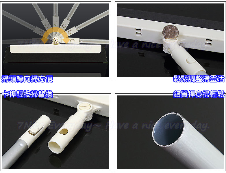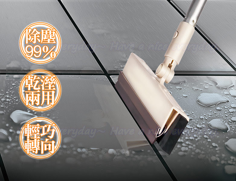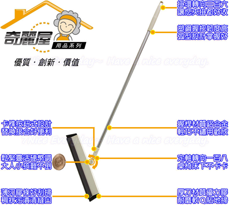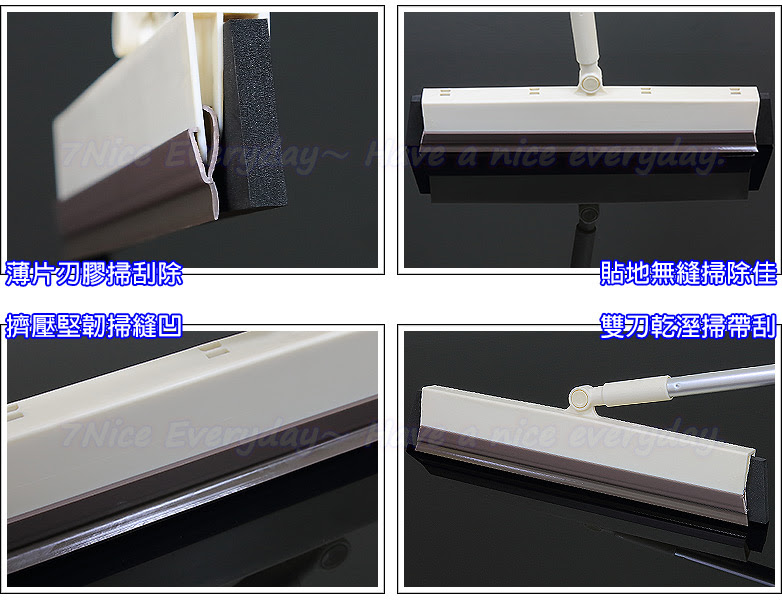 厚刀鋒具柔軟彈性,貼地力佳。薄刀鋒主要清潔磁磚、大理石磚......等接縫溝內之不易清除之污垢。耐用不變形,除塵、去污、刮水樣樣行。180度可旋轉掃頭,清掃無死角,容易清洗